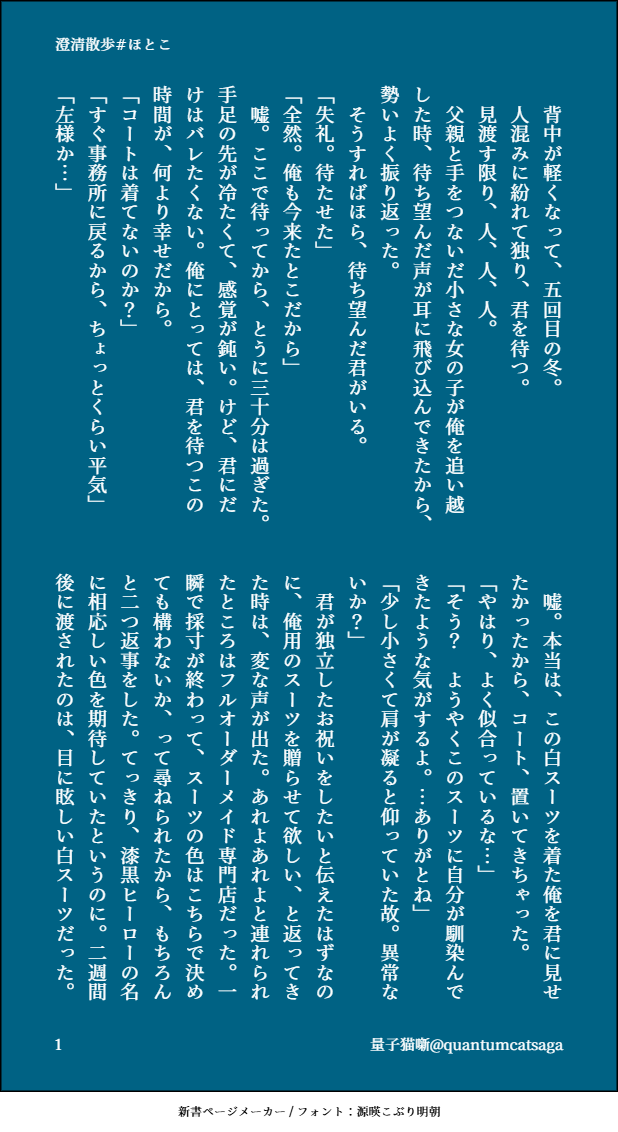 quantumcatsaga☆quiet followDONEホー常クリスマス&イルミネーションをテーマに短く書きたいと思って書いたやつですあんまりクリスマス感はないかもしれない… #ホー常 hoEra show all(+1 images) Tap to full screen (size:618x1132).Repost is prohibited Let's send reactions! freqpopularsnackothersPayment processing Replies from the creator Follow creator you care about!☆quiet follow quantumcatsagaDONEホー常ワンドロワンライ様より、お題「アルコール」「30歳」お借りしました!付き合ってないホー常です。 2 quantumcatsagaDOODLE常くんに指ハートして欲しかった… quantumcatsagaDONEホー常ワンドロワンライ様よりお題「駄々をこねる」「気が早い」お借りしました!時間かかってしまいましたが、なんとか…… 4 quantumcatsagaDOODLEカッコよく描きたかった…バタッ quantumcatsagaDONEエクスで流行ってるやつやってみた3時間かけてこの体たらくだけどなんか満足したのでヨシ! quantumcatsagaDONEホー常ワンドロワンライ様よりお題「寝言」お借りしました。ゆるふわ設定ですが公安委員長ホ×プロヒ常くんです。常くんお酒弱くても強くても良い。 2 related works hnrsmPROGRESS初期のやつ描き直し中 kizakiDONEホー常1コマ漫画ホー常WEBオンリー「暁の鷹は月と添う3」 quantumcatsagaDONEホー常ワンドロワンライ様より、「束縛系彼氏」「包容力抜群」をお借りしました遊〇王のカードゲームをしている同年代ほとこです、雰囲気で感じてくださいなんとなくやiおiもiもちゃん視点です 4 hnrsmDONE同級生ホー常※同世代アンソロに惜しくも落選(?)したネタ。といいつつ同世代アンソロとは別の世界線ですこの真夏に冬ネタですなんで?? hnrsmDOODLEホー常どうも私にはホに常くんを上に乗せてほしい願望(なにそれ)があるっぽくて気を抜くと常くんが上に乗ってるっぽい絵を描いてしまうんですよね haruka10hrakDOODLEホー常webオンリー展示作品①暁月の鷹は月と添う以前描いた、私的ホー常イメソンの描きたい所だけシリーズの続きを描きました。雰囲気だけ…⚠️上半身脱いでいるのと行為の前後を想像させる描写なのでR15くらい(してないし下は出てない)⚠️なんでも許せる方はどうぞ「with-you」「未来航路」からイメージさせて頂きました。 5 pttemaaDOODLEホー常 鳥師弟だよ kizakiDONE大戦後にホ常耳でご飯に行く話ホー常WEBオンリー「暁の鷹は月と添う3」展示です 4 haruka10hrakDOODLEホー常webオンリー展示作品②暁の鷹は月と添うお題を使用させて頂きました。①「じれったい」「両片想い」※DK先輩×後輩パロです。②「冬の日の朝」※お付き合いしている2人。ジェ○ピ○のもこもこしたお揃いのウェア着ていたら可愛いな…(更にラクガキレベルです)※セリフが少し変わりました。敬語なのも良きだった(2022.12.12) 2 recommended works たかからDOODLEX(旧:Twitter)にて載せたホー常漫画の後日談🔞妄想です。殴り描きのため線画が荒いです。 3 たかからDOODLEいっぱい出た日の🦅🐦⬛🔞 2 たかからDONEホー常オンリー暁の鷹は月と添う4記念展示漫画です。本編は幼き日の🐦⬛と👤のある冬の日となっております。あまりホー常要素は有りませぬが楽しんで頂けると幸いです。 5 quantumcatsagaDONEいい双子の日!ダクシャと常くん黒常のような気がするけどなんとなく影常と表記したかった… 4 quantumcatsagaDONEブルスカで呟いた焦常です雪の日で黒影と一緒に遊ぶ常闇くんが、けっこうはしゃいでたら嬉しいと思って衝動的に書きました 4 水底流-FLOWDOODLEサマイチ 𝕂𝕒𝕣𝕚𝕟DONEMerry Christmas⛄🎄✨ komaki_etcDOODLE雨想。スタバのカスタム 1757 Sak_iDOODLEルフユ