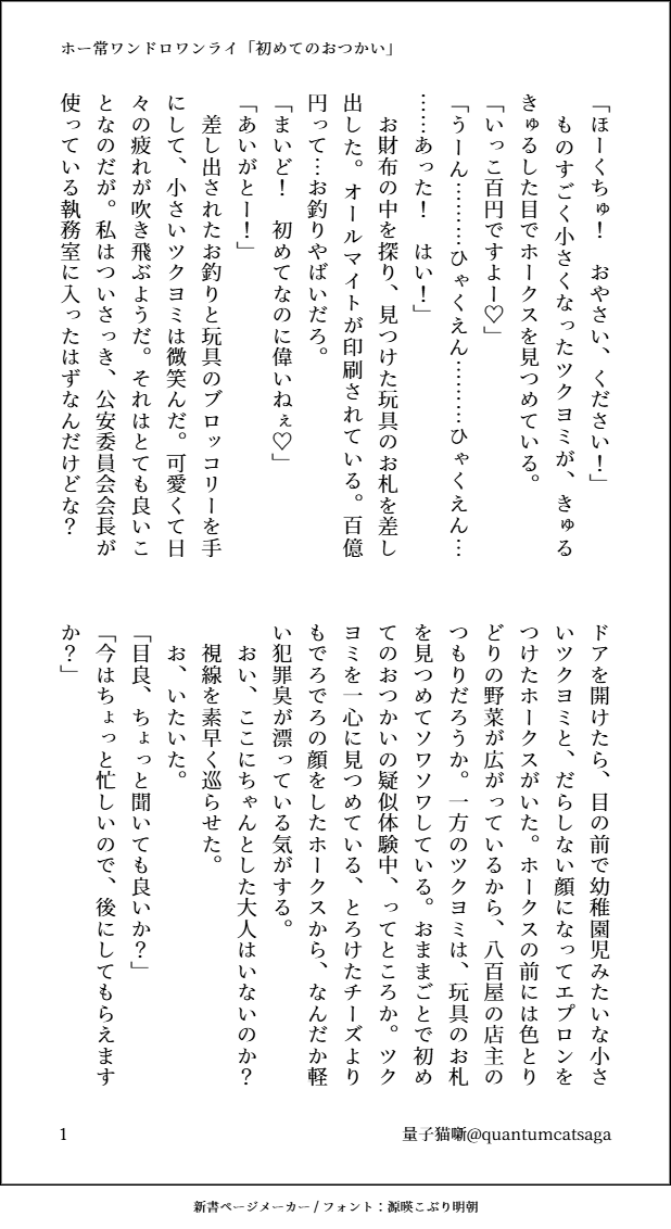quantumcatsaga☆quiet followDONEホー常ワンドロワンライ様より、お題「初めてのおつかい」お借りしました!一応20歳のツクヨミと公安委員会会長なホークスと、目良さん、レディ・ナガンの友情出演です! #ホー常 hoEra show all(+3 images) Tap to full screen (size:618x1132).Repost is prohibited Let's send reactions! freqpopularsnackothersPayment processing Replies from the creator Follow creator you care about!☆quiet follow quantumcatsagaDONEホー常ワンドロワンライ様より、お題「アルコール」「30歳」お借りしました!付き合ってないホー常です。 2 quantumcatsagaDOODLE常くんに指ハートして欲しかった… quantumcatsagaDONEホー常ワンドロワンライ様よりお題「駄々をこねる」「気が早い」お借りしました!時間かかってしまいましたが、なんとか…… 4 quantumcatsagaDOODLEカッコよく描きたかった…バタッ quantumcatsagaDONEエクスで流行ってるやつやってみた3時間かけてこの体たらくだけどなんか満足したのでヨシ! quantumcatsagaDONEホー常ワンドロワンライ様よりお題「寝言」お借りしました。ゆるふわ設定ですが公安委員長ホ×プロヒ常くんです。常くんお酒弱くても強くても良い。 2 related works hnrsmDONE同級生ホー常※同世代アンソロに惜しくも落選(?)したネタ。といいつつ同世代アンソロとは別の世界線ですこの真夏に冬ネタですなんで?? kizakiDONEホー常1コマ漫画ホー常WEBオンリー「暁の鷹は月と添う3」 hnrsmDOODLEホー常どうも私にはホに常くんを上に乗せてほしい願望(なにそれ)があるっぽくて気を抜くと常くんが上に乗ってるっぽい絵を描いてしまうんですよね haruka10hrakDOODLEホー常webオンリー展示作品①暁月の鷹は月と添う以前描いた、私的ホー常イメソンの描きたい所だけシリーズの続きを描きました。雰囲気だけ…⚠️上半身脱いでいるのと行為の前後を想像させる描写なのでR15くらい(してないし下は出てない)⚠️なんでも許せる方はどうぞ「with-you」「未来航路」からイメージさせて頂きました。 5 quantumcatsagaDONEホー常ワンドロワンライ様より、「束縛系彼氏」「包容力抜群」をお借りしました遊〇王のカードゲームをしている同年代ほとこです、雰囲気で感じてくださいなんとなくやiおiもiもちゃん視点です 4 kizakiDONE大戦後にホ常耳でご飯に行く話ホー常WEBオンリー「暁の鷹は月と添う3」展示です 4 hnrsmPROGRESS初期のやつ描き直し中 pttemaaDOODLEホー常 鳥師弟だよ haruka10hrakDOODLEホー常webオンリー展示作品②暁の鷹は月と添うお題を使用させて頂きました。①「じれったい」「両片想い」※DK先輩×後輩パロです。②「冬の日の朝」※お付き合いしている2人。ジェ○ピ○のもこもこしたお揃いのウェア着ていたら可愛いな…(更にラクガキレベルです)※セリフが少し変わりました。敬語なのも良きだった(2022.12.12) 2 recommended works pttemaaDOODLEホー常 鳥師弟だよ LekoDOODLE2019年に発行した本の再録です。データが飛んだ為本をスキャンしているので読みづらい部分もあります。海辺の別荘で二人が束の間のバカンスを楽しむショートストーリーです。作中で二人が作る料理のレシピと、オマケのイラストがフルカラーで載っています。二人とも成人済み時空です 17 Lian0809DOODLE 2 くらうんDONE⚠︎︎2021年に書いたものなのでホークスはヒーローのままです。 5528 quantumcatsagaDONEホー常でいい夫婦の日です!ほのぼの日常を目指しました 4 quantumcatsagaDONEホー常クリスマス&イルミネーションをテーマに短く書きたいと思って書いたやつですあんまりクリスマス感はないかもしれない… 2 ゆめこぼしDONE孤月さんに弱点触られてぐずぐずの🍵坎♀ちゃん 2 𝙢𝙪𝙜𝙞𝙘𝙝𝙞𝙮𝙤DOODLEえびおさん新衣装すごい un_eatPROGRESSwip 1月に出すシールこんな感じの🎄モチーフになります 時期はずれだけど許してください… 3