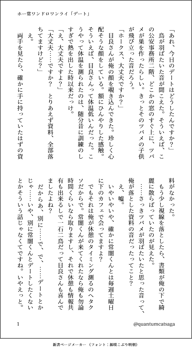 quantumcatsaga☆quiet followDONEホー常ワンドロワンライ様よりお題「デート」お借りしました!カフェデート欲しかったね… #ホー常 hoEra show all(+4 images) Tap to full screen (size:618x1132).Repost is prohibited Let's send reactions! freqpopularsnackothersPayment processing Replies from the creator Follow creator you care about!☆quiet follow quantumcatsagaDONEホー常ワンドロワンライ様よりお題「デート」お借りしました!カフェデート欲しかったね… 5 quantumcatsagaDONEホー常ワンドロワンライ様より、お題「編み物」お借りしました!原作後くらい…?のイメージです。 3 quantumcatsagaDONEホー常ワンドロワンライ様より、お題「アルコール」「30歳」お借りしました!付き合ってないホー常です。 2 quantumcatsagaDOODLE常くんに指ハートして欲しかった… quantumcatsagaDONEホー常ワンドロワンライ様よりお題「駄々をこねる」「気が早い」お借りしました!時間かかってしまいましたが、なんとか…… 4 quantumcatsagaDOODLEカッコよく描きたかった…バタッ related works quantumcatsagaDONEホー常ワンドロワンライ様より、「束縛系彼氏」「包容力抜群」をお借りしました遊〇王のカードゲームをしている同年代ほとこです、雰囲気で感じてくださいなんとなくやiおiもiもちゃん視点です 4 hnrsmDOODLEホー常どうも私にはホに常くんを上に乗せてほしい願望(なにそれ)があるっぽくて気を抜くと常くんが上に乗ってるっぽい絵を描いてしまうんですよね hnrsmDONE同級生ホー常※同世代アンソロに惜しくも落選(?)したネタ。といいつつ同世代アンソロとは別の世界線ですこの真夏に冬ネタですなんで?? hnrsmPROGRESS初期のやつ描き直し中 haruka10hrakDOODLEホー常webオンリー展示作品①暁月の鷹は月と添う以前描いた、私的ホー常イメソンの描きたい所だけシリーズの続きを描きました。雰囲気だけ…⚠️上半身脱いでいるのと行為の前後を想像させる描写なのでR15くらい(してないし下は出てない)⚠️なんでも許せる方はどうぞ「with-you」「未来航路」からイメージさせて頂きました。 5 pttemaaDOODLEホー常 鳥師弟だよ haruka10hrakDOODLEホー常webオンリー展示作品②暁の鷹は月と添うお題を使用させて頂きました。①「じれったい」「両片想い」※DK先輩×後輩パロです。②「冬の日の朝」※お付き合いしている2人。ジェ○ピ○のもこもこしたお揃いのウェア着ていたら可愛いな…(更にラクガキレベルです)※セリフが少し変わりました。敬語なのも良きだった(2022.12.12) 2 kizakiDONEホー常1コマ漫画ホー常WEBオンリー「暁の鷹は月と添う3」 kizakiDONE大戦後にホ常耳でご飯に行く話ホー常WEBオンリー「暁の鷹は月と添う3」展示です 4 recommended works m0ny_r0nyDOODLE◆ホー常小ネタ100万回使われているだろうアイスについての小ネタ。カッコいい🦅はいません。ある意味成長著しい🐥くんはいます。 2776 LekoDOODLE2019年に発行した本の再録です。データが飛んだ為本をスキャンしているので読みづらい部分もあります。海辺の別荘で二人が束の間のバカンスを楽しむショートストーリーです。作中で二人が作る料理のレシピと、オマケのイラストがフルカラーで載っています。二人とも成人済み時空です 17 もふ吉DONEキャス弓描きたい所だけ。いつもと同じくらいのサイズにしたら潰れてしまったのでちょっとデカサイズです😅 oekou_so2DONEフォロワーさんと夜中のテンションで話してたらディアスのでぃあすが大変なことになりました。pass…でぃあす 13 たかからMOURNINGあけおめことよろの🦅🐥👤2024🐉 たかからDONEX(旧Twitter)に投稿したホー常漫画の後日談です。⚠️ピロートークなので🔞までは行きませんが肌色多めなので背後注意です。 2 くらうんDONEホークスの誕生日のお祝いの話です⚠︎︎2020年に書いたものなので、公安委員会委員長は生きてる設定でホークスもヒーローのままです。 6882 quantumcatsagaDONEいい双子の日!ダクシャと常くん黒常のような気がするけどなんとなく影常と表記したかった… 4 quantumcatsagaDONEブルスカで呟いた焦常です雪の日で黒影と一緒に遊ぶ常闇くんが、けっこうはしゃいでたら嬉しいと思って衝動的に書きました 4