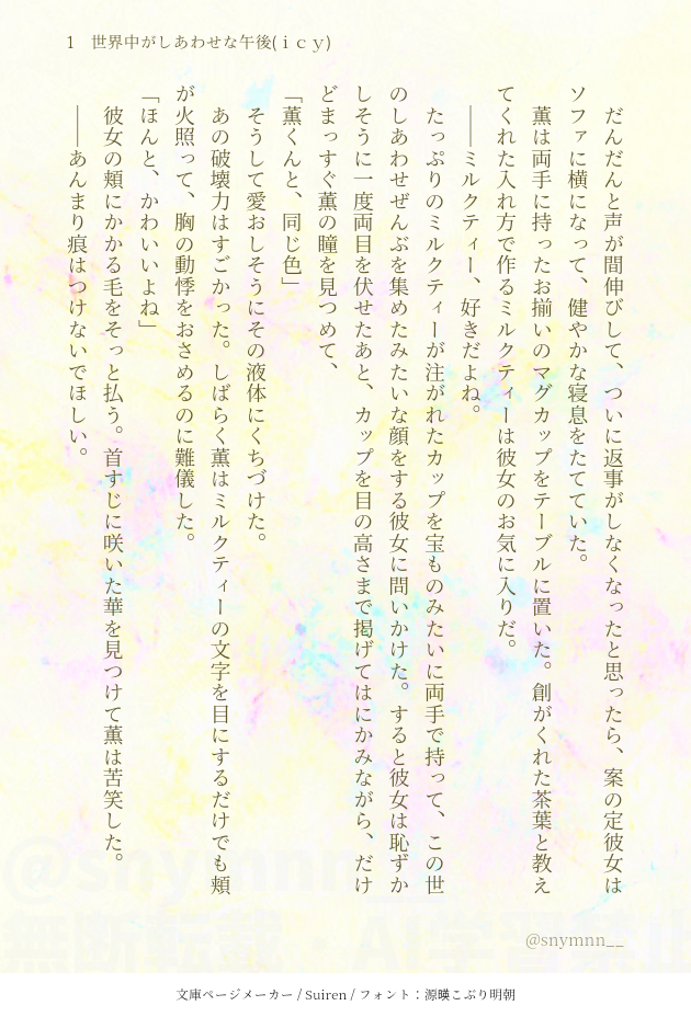 snymnn__☆quiet followDONEkorと彼女のしあわせな午後 #enstプラス enstPlus show all(+4 images) Tap to full screen (size:630x928).Repost is prohibited Let's send reactions! freqpopularsnackothersPayment processing Replies from the creator Follow creator you care about!☆quiet follow snymnn__DONEkorのことが好きすぎる彼女のはなし② 7 snymnn__DONEkorのことが好きすぎる彼女のはなし 3 snymnn__DONE新生紅月お披露目ライブ前のちょっとしたはなし 4 snymnn__DONEkor/俺から言わせてねフォロワちゃんの恋バナより(ありがとうございました❣️) 5 snymnn__DONEibk夏の日 2 snymnn__PROGRESSknt② 3 related works ato_dream_DONEenstジュン夢噛む理由について話すお話🐺⚠️凪砂くんにも彼女がいる前提です 930 ato_dream_DONEenst凪砂夢ライブ後のお話です! 660 ato_dream_DONEenst 瀬名泉夢6月の#妄想力向上委員会 様のお題に参加した時のものです!素敵な企画をありがとうございます🥺 941 ato_dream_DONEenst凪砂夢雨の日に彼女が傘を持って待っていたら車と自分の傘の選択肢を全て無視して彼女と一緒に相合い傘して帰ってくれる凪砂くん 1032 ato_dream_DONEenst凪砂夢完全に出遅れました。キスの日凪砂です💋 361 ato_dream_DONEenst凪砂夢テレビよりも自分に夢中になってほしい凪砂くん 543 ato_dream_DONEenst凪砂夢プロポーズの日、n年後の未来バージョンです💍 806 ato_dream_DONEenst凪砂夢Twitterにて、#妄想力向上委員会 に参加致しました。素敵な企画をありがとうございます😊 649 ato_dream_MOURNINGenst凪砂夢以前流行っていた時期につらつらと書いたものです。このままお蔵入りも勿体ないと思ったので投稿します! 1306 recommended works ato_dream_DONEenst凪砂夢⚠️ハロウィンボイスネタバレあり公式のハロウィンボイス引用しています!(単なる妄想です) 444 俺の裏DONE #enstプラス rt夢です。別垢で上げてたやつを移動📝⏩📝幼なじみ夢主 2643 しもふみDOODLEガッツリ夢主いますR18 mashiro_mochiSPOILER連載予定の間話短編。逆ハーizmオチ。【enst/izm/いずみ】#enstプラス 4 snymnn__DONEkor予定より1日早く帰ってきた HowlINFOc105、参加。1日目【コ-57b】2日目【え-16b】宮﨑駿と鈴木敏夫の81禁創作BLR-81G(ギャグ)です。新刊は「スーさんと巨匠のアニメバカ日誌4 温泉宿でドッキリ♡同衾!?ポロリもあるヨ!」28pです。アラカーさんのNHKドキュメンタリービデオ(アラカービデオ、略してAV)の内容多めです。ポロリもあるよ!(メイ本当に見たもん!嘘じゃないもん!本当にポロリしてたんだもん! 2 hdW2kcMJoA65232DOODLE描き散らし 2 sakasamanoatamaPAST絵文字天国→https://reizireihunn.wixsite.com/umizoi じゃこDOODLECoC【REGICiDE】ネタバレ注意⚠️我慢ならず落書き。本当に、本当にさぁ……好きなんだよ。。。 3