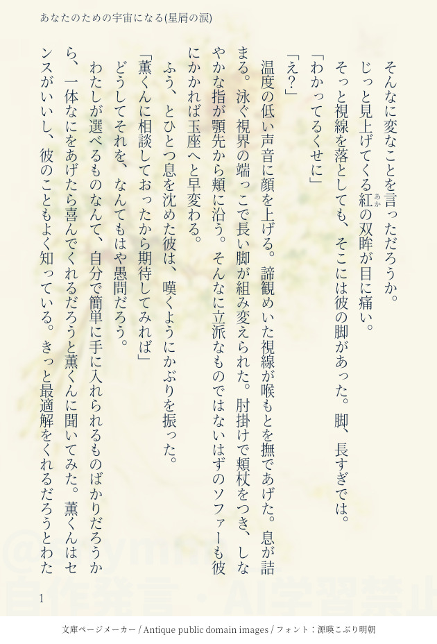 snymnn__☆quiet followDONEri誕 #enstプラス enstPlus show all(+4 images) Tap to full screen (size:630x928).Repost is prohibited Let's send reactions! freqpopularsnackothersPayment processing Replies from the creator Follow creator you care about!☆quiet follow snymnn__DONEkor誕 7 snymnn__DONEri誕 5 snymnn__DONEkorのことが好きすぎる彼女のはなし② 7 snymnn__DONEkorのことが好きすぎる彼女のはなし 3 snymnn__DONE新生紅月お披露目ライブ前のちょっとしたはなし 4 snymnn__DONEkor/俺から言わせてねフォロワちゃんの恋バナより(ありがとうございました❣️) 5 related works ato_dream_DONEenstジュン夢噛む理由について話すお話🐺⚠️凪砂くんにも彼女がいる前提です 930 ato_dream_DONEenst凪砂夢完全に出遅れました。キスの日凪砂です💋 361 ato_dream_DONEenst凪砂夢雨の日に彼女が傘を持って待っていたら車と自分の傘の選択肢を全て無視して彼女と一緒に相合い傘して帰ってくれる凪砂くん 1032 ato_dream_DONEenst凪砂夢プロポーズの日、n年後の未来バージョンです💍 806 ato_dream_DONEenst凪砂夢テレビよりも自分に夢中になってほしい凪砂くん 543 ato_dream_DONEenst凪砂夢Twitterにて、#妄想力向上委員会 に参加致しました。素敵な企画をありがとうございます😊 649 ato_dream_DONEenst 瀬名泉夢6月の#妄想力向上委員会 様のお題に参加した時のものです!素敵な企画をありがとうございます🥺 941 ato_dream_DONEenst凪砂夢ライブ後のお話です! 660 ato_dream_MOURNINGenst凪砂夢以前流行っていた時期につらつらと書いたものです。このままお蔵入りも勿体ないと思ったので投稿します! 1306