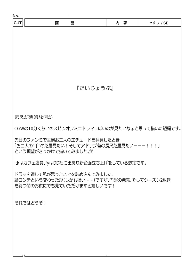 tsukimi_tor0r0☆quiet followPAST『だいじょうぶ』①CGW放送後に行われたファンミ見てたら思いついて描いたやつ。 #CGW show all(+12 images) Tap to full screen (size:2894x4093).Repost is prohibited Let's send reactions! freqpopularsnackothersPayment processing Replies from the creator Follow creator you care about!☆quiet follow tsukimi_tor0r0DOODLE5月~7月描いたものまとめ。いつふゆはもちろんのこと、いろんな映画とかドラマでお気に入りのシーンの模写やったのが個人的に大きかった!好きな作品の良さとか自分の創作の手数増やすためにもキャラと構図を8,9月は頑張りたい! 18 tsukimi_tor0r0DONE『誕生日の手紙』pass:fyの誕生日!数字4ケタもしもitkがfyのお誕生日に手紙を書いていたらどんな内容だろう、という妄想です。どの手紙がどの時代か、よければ想像してみてください!(ドラマの時系列と合っているかやや怪しいけど…)fy、お誕生日ありがとう~!幸せになるんだよ。。 17 tsukimi_tor0r0DOODLE『隣のサンズイ』って映画の場面写真模写。画面すごい良さそう tsukimi_tor0r0TRAINING『目が怖い』CGW2 4話の、fyママの心情について考えてみました。パスワード:itfyは西暦何年生まれ?数字4ケタ清書が間に合わず、、、かなり雑ですが供養ということで。。こういう想いがあってからの、7話でのitkとのやり取りなのかなとひそかに考察しております。 8 tsukimi_tor0r0DOODLE3、4月のXに投稿したイラストまとめ。CGW以外もがっつりあります! 15 tsukimi_tor0r0DONEパスワード:itfyは西暦何年生まれ?(数字4桁)『雨に溶ける言葉』itfy雨降る深夜のドライブ。どの時期なのか、途中にある言葉がどちらの言葉なのかも決めておりませんので、ぜひ自由に想像していただけると嬉しいです!ドラマ一切関係ないのですが、r-906さんの『あまもや』という曲にインスピレーションを受けて描いてみました。お好きなICより合流くださいませ。 8 related works tsukimi_tor0r0DONE『自由のくに』前編CGWのS1で、kbちゃんがどうして天女世界のメンバーに選ばれたのかが気になり想像してみました!モブが数名でてきます。相変わらず変わった形式ですが、よろしければどうぞ!!! 12 tsukimi_tor0r0DONE『自由のくに』後編前回の続きです。CGWに出てくるkbちゃんが、こういう経緯でfyにスカウトされてチーム天女に入ってたらいいなという妄想です…! 11 tsukimi_tor0r0DOODLECGWitfyと友チョコ結果的に二人の愛の重さはめちゃくちゃ濃厚なミルクチョコ並みだと思ってます。各ページで形態が違いますが、話はつながってます! 4 tsukimi_tor0r0DOODLEあけましておめでとうございます🎍みなさん、「謹賀新年」ですよ?間違えないでくださいね😇 tsukimi_tor0r0DOODLEクリスマスのitfytkプール掃除のityrドラマに影響されたDD社feat.店長 3 tsukimi_tor0r0PAST『だいじょうぶ』②『だいじょうぶ』①の続き。この話はこれでおしまいです。 24 tsukimi_tor0r0DONEテスト投稿。CGWのkbちゃん。 tsukimi_tor0r0DONE『かくしごと』yrmが帰国した直後の高校生itkとaoym。かくしごとって悪いことばかりではないですよね。よろしければご覧くださいませ! 10 tsukimi_tor0r0PAST『だいじょうぶ』①CGW放送後に行われたファンミ見てたら思いついて描いたやつ。 13 recommended works tsukimi_tor0r0DONEテスト投稿。CGWのkbちゃん。 tsukimi_tor0r0PAST『だいじょうぶ』①CGW放送後に行われたファンミ見てたら思いついて描いたやつ。 13 tsukimi_tor0r0PAST『だいじょうぶ』②『だいじょうぶ』①の続き。この話はこれでおしまいです。 24 tsukimi_tor0r0DONE『かくしごと』yrmが帰国した直後の高校生itkとaoym。かくしごとって悪いことばかりではないですよね。よろしければご覧くださいませ! 10 tsukimi_tor0r0DOODLECGW 第六話itfy人生篇 tsukimi_tor0r0DOODLECGW2 #07 EDでの未公開シーン忠犬itkの片鱗がいちばん出ていたところ篇。ほんの一瞬だけど殺意MAXな学生itkともはやご褒美にしかなってないfyの「べー!」が最高でした…! tsukimi_tor0r0DOODLECGW2 #08 最終決戦篇~その後……やっと8話描き終わった!!放送から経ってしまいましたが、最後の二人が向き合うところは描いてていろんな感情湧き上がってきて謎に感動した笑S3でまたitkとfy、彼女たちの周りの人たちに会えるのを楽しみにしています!!! 3 tsukimi_tor0r0DONE『自由のくに』前編CGWのS1で、kbちゃんがどうして天女世界のメンバーに選ばれたのかが気になり想像してみました!モブが数名でてきます。相変わらず変わった形式ですが、よろしければどうぞ!!! 12 tsukimi_tor0r0DOODLEクリスマスのitfytkプール掃除のityrドラマに影響されたDD社feat.店長 3
