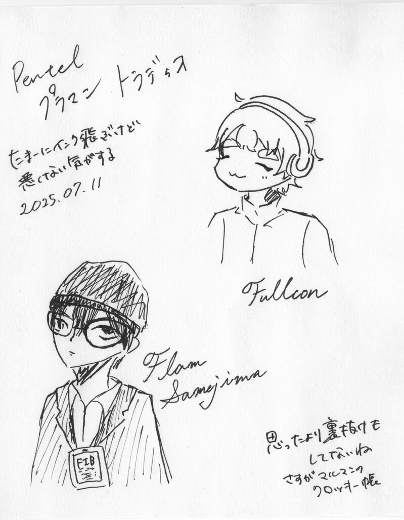 ぺんてるのプラマン、ずっと気になってたんですよね。線画用のペンが欲しくて。水性ペンなので乾く前に触ると大惨事ですがけっこう描きやすかったです。落書きにいい。