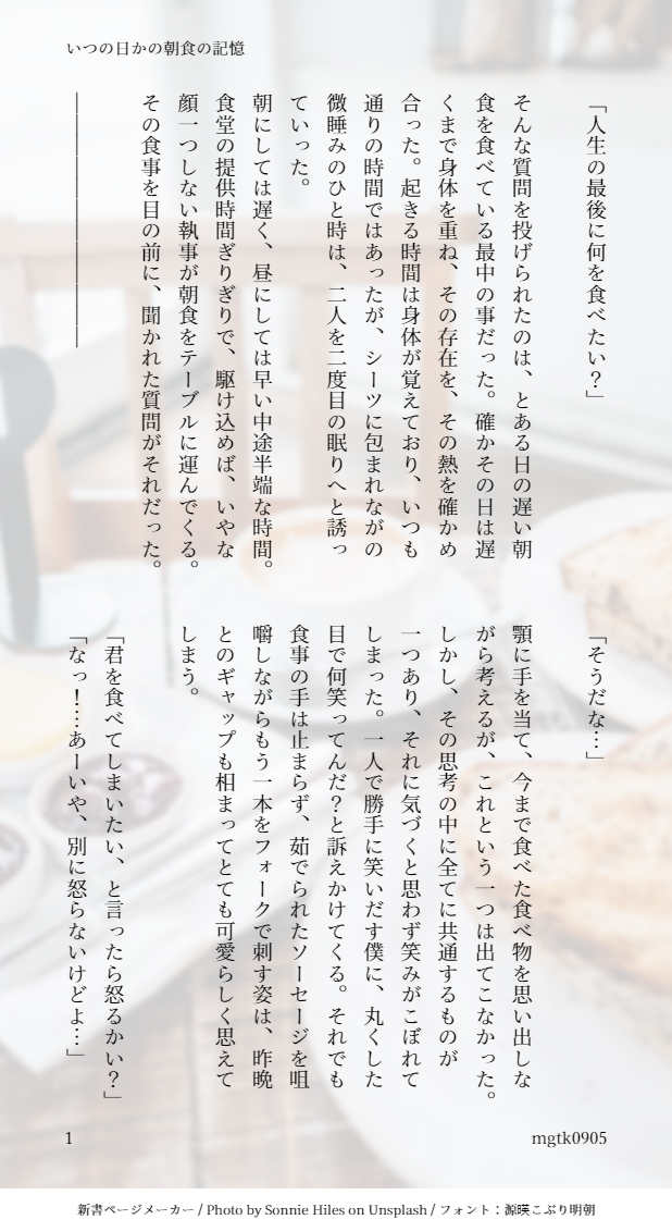 mgtk0905☆quiet followDONEいつの日かの朝食の記憶 / カウオフェ #カウオフェ版60分一本勝負 show all(+2 images) Tap to full screen (size:618x1132).Repost is prohibited Let's send reactions! freqpopularsnackothersPayment processing Replies from the creator Follow creator you care about!☆quiet follow mgtk0905DONEいつの日かの朝食の記憶 / カウオフェ #カウオフェ版60分一本勝負 3 mgtk0905DONE朝食にはコーヒーを1杯 / 探傭 4 mgtk0905DONE手の傷跡の話 / カウオフェ #カウオフェ版60分一本勝負 3 mgtk0905DONE背中の傷跡の話 / カウオフェ 2 mgtk0905PROGRESSカウオフェ(捧げもの用) 5 related works oohasuDONE #カウオフェ版60分一本勝負カウオフェ版ワンドロお題「スローダウン」取り込み編集+30min カウは積極的なイメージないから、あえて。この後、スローダウンしないで頂きたい。 mgtk0905DONE手の傷跡の話 / カウオフェ #カウオフェ版60分一本勝負 3 mgtk0905DONEいつの日かの朝食の記憶 / カウオフェ #カウオフェ版60分一本勝負 3 recommended works mgtk0905DONE手の傷跡の話 / カウオフェ #カウオフェ版60分一本勝負 3 mgtk0905DONEいつの日かの朝食の記憶 / カウオフェ #カウオフェ版60分一本勝負 3 hasunobanninMEMO「推しカプの相性をプロの占い師に占ってもらった話」恐ろしいことに実録漫画です。最近オタク界隈で有名な湊きよひろ先生(@nil_plus)に、シルインの相性をみていただきました!!(レポの許可は頂いておりますが、何かまずい点があれば取り下げます)ピクスク内webイベント「青獅子男女!」web展示漫画※創作やオタ活の個人的なメインの診断もとても面白かったので、いずれTwitterにあげます! 7 ぽん (°▽°)DONE⚠️女体化注意オルルディ子襲い受け気持ちはいつでも「朗報!オルルディ子ダヨ!」 saori514DOODLE kuzuyaro_nekoDOODLEftnr扉︎︎ ♀×柱のらくがき※女体化 3 卯生るうDONEC105新刊デジタル版3(見開きページ)です!!これは結構紙媒体と色合い違うはず、、、、!なぜならCMYK入稿なのにわたしがRGBで作成していたからです!マジの馬鹿野郎です。、、、、が、紙媒体の方もめっっっっちゃ綺麗な仕上がりで感動しました。もうグラフィックさんに足向けて寝れないよう、、、、、。 2 Crow_DipperDONE※才ノア(♂想定)R-18です※書き納め※支部にはいつかこっそり上げる予定pass:18↑? y/n 4007 ぼろぼろDOODLEククマルバニー69すけべ絵passはいつものですなんとなく大きさは受だけどマの方が大きいといいなって思ってます