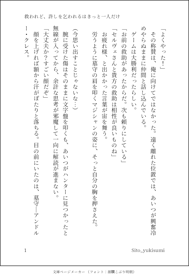Sito_yukisumi☆quiet followDONE呟くアカウントを間違えたので再掲😇傭兵と墓守が会話してるお話(気持ちは魔傭) show all(+6 images) Tap to full screen (size:630x928).Repost is prohibited Let's send reactions! freqpopularsnackothersPayment processing Replies from the creator Follow creator you care about!☆quiet follow Sito_yukisumiDONEフリートにあげた魔傭軸の傭が泥と庭と話す話(前回の弁と傭が話す話の直後) 12 Sito_yukisumiPROGRESSタンヨのロビー君との会話書けた(˙◁˙) Sito_yukisumiPROGRESS書きかけの探傭(になる予定)が煮詰まってるから序盤の好きなシーンを漫画にして遊んでた。ペン入れしたらイライさんの顔が丸くなってしまったので入れる前の写真で台詞だけデジタル…そしてまたノートンさんはいない。 Sito_yukisumiDONE呟くアカウントを間違えたので再掲😇傭兵と墓守が会話してるお話(気持ちは魔傭) 7 Sito_yukisumiMEMOこのシーンまで辿り着くのにえらい時間が掛かりそうなのでメモ…の探傭(になる予定のやつ)(探は出てこない) 2 Sito_yukisumiDOODLE魔傭(だと思う) 7 recommended works 。。。。DOODLEヒソゴン/NSFW注意/p2血表現あり 3 yinyaoMEMO q96896bDOODLEスリット姦囚人ンル×シチュクレア途中から尻尾消えてた 3 安郁卿DOODLE这些个也放着吧都发不出去🥲 3 ytban275DOODLEvoid 드림놀이미공개 npc주의PW: void 5 白百合DONE 2 Octocomics-BLDOODLE 🫀🔪🩸DOODLEモブスグ18↑? 4 Koyomu13DONEYoshiden version of "I want to be killed by your beautiful self" cover