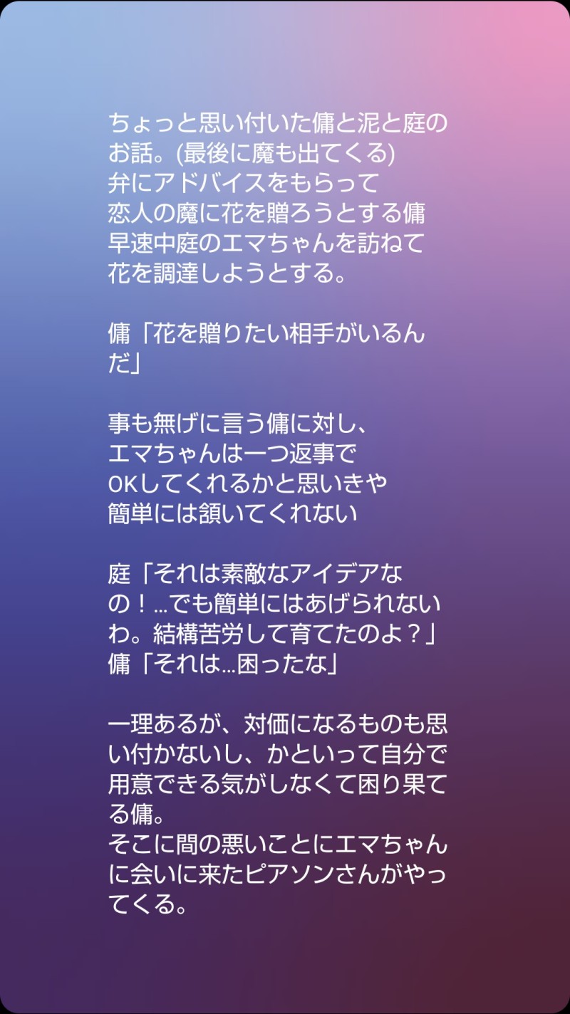 Sito_yukisumi☆quiet followDONEフリートにあげた魔傭軸の傭が泥と庭と話す話(前回の弁と傭が話す話の直後) show all(+11 images) Tap to full screen (size:1080x1923).Repost is prohibited Let's send reactions! freqpopularsnackothersPayment processing Replies from the creator Follow creator you care about!☆quiet follow Sito_yukisumiDONEフリートにあげた魔傭軸の傭が泥と庭と話す話(前回の弁と傭が話す話の直後) 12 Sito_yukisumiPROGRESSタンヨのロビー君との会話書けた(˙◁˙) Sito_yukisumiPROGRESS書きかけの探傭(になる予定)が煮詰まってるから序盤の好きなシーンを漫画にして遊んでた。ペン入れしたらイライさんの顔が丸くなってしまったので入れる前の写真で台詞だけデジタル…そしてまたノートンさんはいない。 Sito_yukisumiDONE呟くアカウントを間違えたので再掲😇傭兵と墓守が会話してるお話(気持ちは魔傭) 7 Sito_yukisumiMEMOこのシーンまで辿り着くのにえらい時間が掛かりそうなのでメモ…の探傭(になる予定のやつ)(探は出てこない) 2 Sito_yukisumiDOODLE魔傭(だと思う) 7 recommended works T12FrDOODLE女装攻め🔞シーン3枚 パス(y/n) 3 アカエPROGRESSクロクル 花吐き病? なす畑2号店SPOILERまだ間に合う!愚かな推理! 4 hakuto_v_PROGRESSちまちま頑張ってる 2 墨谷仁DONE友人のGMに回してもらったブドウの血の聖女がエモかったので、記念絵。ノスフェラトゥと聖女・テレーズ。2枚目はラフ。 2 queenofthefamilDOODLECoC『GODARCA』げんみ❌自陣は️⭕️女教皇のss書いてみた! 2195 お抹茶🍵DOODLEイラスト展示 14 M2V009DONEマミコさん(@CethW)作のアンザックラ小説をご本人の許可をいただいてイラストに起こさせていただきました…!😭🫶🔵こちらは【アンザク編】です🔞(3ページ)⚠️イラストはアンザクですが、文章中にはクラウドがいます。ご了承いただけた方のみどうぞ🥹18↑?(yes or no) 3 天音セル/夜明けの流刑地DOODLE???「オレに…構うな…!!」 2
