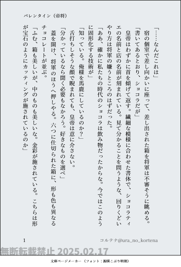 コルテナ☆quiet followDONE遅刻だけど書きたくなったので、バレンタインネタの帝将短文です。この前書いた、グレロン編の内容を前提にしているので、少しわかりにくいところがあります。 #帝将 #サガエメ show all(+5 images) Tap to full screen (size:630x928).Repost is prohibited Let's send reactions! freqpopularsnackothersPayment processing Replies from the creator Follow creator you care about!☆quiet follow コルテナDONE一応ホワイトデーを意識した王将です。うっすらバレンタインネタの続き。王者くんに花束を差し出して欲しかっただけです。糖度が高いです。 6 コルテナDONE王者×将軍。なんでこの二人なんだろう、を自分なりに初心に返って考えてみました。 11 コルテナDONE大遅刻のバレンタインネタの王将バージョンです。糖度高め。 8 コルテナDONE遅刻だけど書きたくなったので、バレンタインネタの帝将短文です。この前書いた、グレロン編の内容を前提にしているので、少しわかりにくいところがあります。 6 コルテナDONE本編より千年前のグレロン編です。将軍の闇(Aルート)で、将軍のことを覚えていない最終皇帝と将軍が復縁する(予定)のお話ですが、これだけでも読めます。独自解釈を、これまでで一番盛り込んでいます。匂わせる程度の描写ですが、性的な関係を前提としています。シリーズはこちらにまとめてあります。pixivhttps://www.pixiv.net/novel/series/12624302 27 コルテナDONEタイトル通り、アヴァロンの紅茶とビスケットを食べる王者と将軍のお話です。CP要素はかなり薄いというか成立してない感じですが、王将風味です。あの辛辣で話がちょっと通じないところのありそうな王者くんが、将軍の命令をわりと絶対視しているのがうかがえるところが好きです。こんな感じで、連接世界の色々なものを食べたり飲んだりする将軍や戦士団や終帝の話を、これからちょこちょこ書いていけたらいいなあと思っていま 7 related works rukua_jubDONEメイン展示です。 towtezDONE2025/10/14帝将webオンリー展示漫画『仮面の貌』12P。全年齢。2025/10/14 20:00 - 2025/10/21 23:59 まで公開。⚠︎帝国時代のふたりです。将軍は大臣職で皇帝にもタメ口利くくらい近しい仲など、色々自由に設定しています。 13 towtezDOODLE⚠️最終皇帝x将軍(軽く)ハロウィン漫画のつづきのつづき。前回:https://poipiku.com/1498774/11312953.htmlヨミをうろついてたら色欲の塔主に絡まれた帝将です。結婚税は払いません。 3 コルテナDONE遅刻だけど書きたくなったので、バレンタインネタの帝将短文です。この前書いた、グレロン編の内容を前提にしているので、少しわかりにくいところがあります。 6 kumiko_yTRAINING帝将オンリー用にと、自主練しました…肌色は難しいね…体格差は好みにできました😊💖 rukua_jubDOODLEwebイベ用に帝将だけまとめました。ルート時系列ごっちゃ。 25 コルテナDONE本編より千年前のグレロン編です。将軍の闇(Aルート)で、将軍のことを覚えていない最終皇帝と将軍が復縁する(予定)のお話ですが、これだけでも読めます。独自解釈を、これまでで一番盛り込んでいます。匂わせる程度の描写ですが、性的な関係を前提としています。シリーズはこちらにまとめてあります。pixivhttps://www.pixiv.net/novel/series/12624302 27 kumiko_yDONEふぉろわさんよりリクエストをいただいた将軍…自分の精一杯😂✨ kumiko_yDONE帝将お膝抱っこ絵がやっとできた…🙌💕
