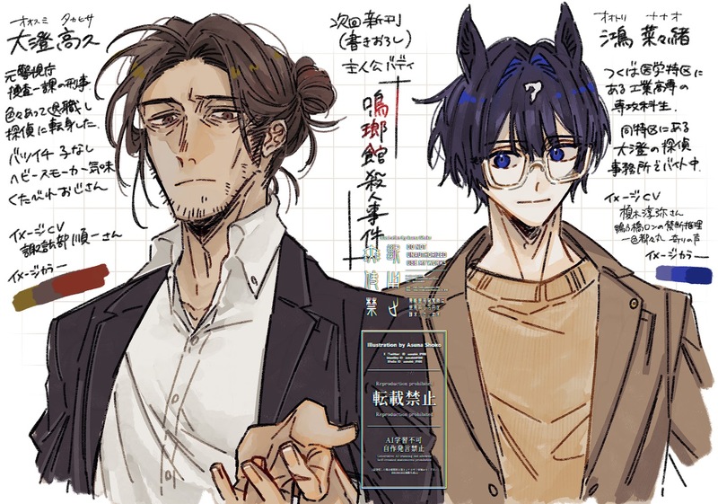 アスナショウコ☆quiet followDONE次回文学フリマで出したい書き下ろし小説・新刊「鳴瑯館殺人事件(仮題)」の主人公男男バディの設定絵~~~~ 軸としてはレゾン・デートル寄りです探偵・大澄高久と助手・鴻菜々緒 二人合わせて007 ##馬子軸_総合 Tap to full screen (size:1470x1031).Repost is prohibited Let's send reactions! freqpopularsnackothersPayment processing Replies from the creator Follow creator you care about!☆quiet follow アスナショウコDONEヴォーティーガーン/白銀真冬のらくがき ちょっとした設定なども書いてます 3 アスナショウコDOODLE久々に描いた桔梗さん(椿のお母ちゃん)と、勝手にここ数日間妄想させてもらってるシャルラッハロート軸の椿(ロリのすがた)のらくがき 2 アスナショウコDOODLE嘴馬先生(と舐めニキ)……… 3 アスナショウコDONE幻想種ヴィーヴィル〈ホルアクス〉の絵 デザイン優勝したのではこれ めっちゃ良くないですか 黒い天使と白い死神……めちゃくちゃ勝手にクレマリー先生との対比というかクレマリー先生をめちゃくちゃ意識したデザインにしている(つもり)なんですがどうでしょう有識者の皆さん 2 アスナショウコDONE次回文学フリマで出したい書き下ろし小説・新刊「鳴瑯館殺人事件(仮題)」の主人公男男バディの設定絵~~~~ 軸としてはレゾン・デートル寄りです探偵・大澄高久と助手・鴻菜々緒 二人合わせて007 アスナショウコDOODLE人類舐め蔵 原生神秘・原初の陸ミカエル=クロー・マクシミリアン
