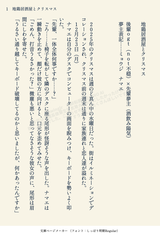 すうぃんぐ☆quiet followDONEクリスマスに地鶏居酒屋に行く後輩ogtと先輩夢主。not不穏。なんか朝ちゅん。 #金カ夢 aimingForTheGoldenHelix #夢小説 dreamNovel #現パロ parodyingTheReality show all(+9 images) Tap to full screen (size:630x928).Repost is prohibited Let's send reactions! freqpopularsnackothersPayment processing Replies from the creator Follow creator you care about!☆quiet follow すうぃんぐDONE尾た尾め滑り込み後輩ogt誕生日夢です。後輩ogt×先輩夢主(つきあっていない)ノー残業デーに飲みに誘ったら偶然ogtの誕生日だったというとりとめもない話。 8 すうぃんぐDONEクリスマスに地鶏居酒屋に行く後輩ogtと先輩夢主。not不穏。なんか朝ちゅん。 10 すうぃんぐDONE金カ夢 現パロ/会社の後輩ogt君と先輩夢主 7 すうぃんぐPAST洋/画 蝋人形/三男坊 シンクレア三男坊 暴力的、性的表現有。ちょい不穏。ただ45ってる三男坊です!!色々アレなので自己責任で!! 4 related works tamae_izawaDOODLE何でも許せる方向け 現パロ 素顔捏造 ざっとさん 寝起き モエンジュDONE【ドフロ】2023/1/8に頒布した現パロドフロの同人誌『兄上の恋バナが聞きたいッ!』のペーパーでした🫶この後怒涛のドフ→→→ロ期間が始まります😁 5 nobunaga49DONE頭身高い絵柄でサウジャギ。 7 nobunaga49DONEサウジャギ詰め合わせ。 17 🚄≡≡≡シュインTMP-SAVE #金カム #現パロ #エノノカ #二階堂兄弟原作にはない絡み注意 軍曹に言われてお守り役に徹する双子 nobunaga49DONEサウジャキ。現パロでサウザーとジャギと言うCPを楽しんでます。サウザーはお金持ちでとジャギ子ちゃんはふたなり。 3 モエンジュDOODLE【コラロ】ネタメモ アナログローにだけ可愛こぶりっ子するコラさん×コラさんは可愛い人だから自分がかっこよくなって守らなきゃと思ってるロー暫定タイトル『貴方は可愛い人だから』 6 モエンジュDONE【ドフロ】2023/1/8のペーパー②本文のワンシーンを描きました😊ドフロが可愛い恋愛してるところを5億回浴びたいです🥹🦩🐯🫶 sssspoon9696DONE