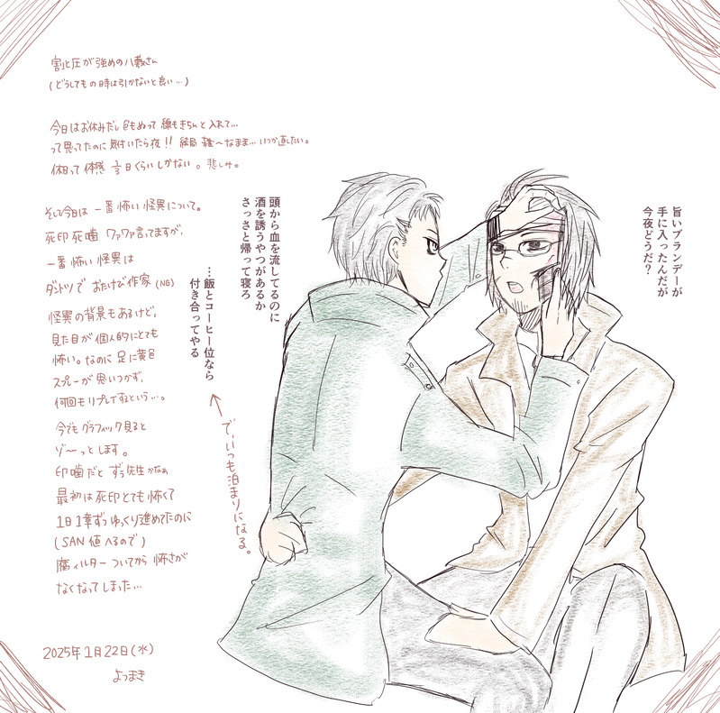 ヨツマキ @yotsumaki1108 AI対策として何か描いたらこっちに上げるように作ってみました。シ印、噛の八と真メインになるはず。八真で腐ってます。絵を描くのに慣れてきたら絡ませたい!他のゲームやら好きなものも雑多に突っ込みます。 ☆quiet follow Yell with Emoji POIPOI 28