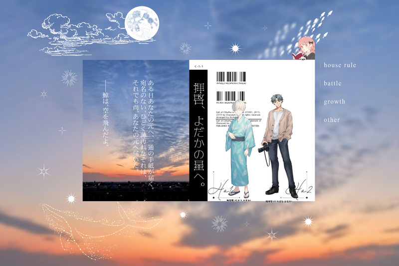 marble_maa☆quiet followINFOCoC「拝啓、よだかの星へ」KP:あまなつHO1:無窓霞(まぁ)HO2:橘晴架(あさしま)両生還!綺麗で小説のようなシナリオだった。素敵なお話ですごく良かった。初めて盲目の子を演じたけど、RPいっぱいできて楽しかった。ありがとうございました! Tap to full screen (size:4202x2801).Repost is prohibited Let's send reactions! freqpopularsnackothersPayment processing Replies from the creator Follow creator you care about!☆quiet follow marble_maaINFOCoC「同じ空には昇れない。」KP:あまなつHO太陽:朝比奈晴真(まぁ)HO月:ナハト・ディートリヒ(なが)両生還!!!最高だったー!!!自陣アニメ化求む!!!シナリオ素敵だったし、めっちゃ好みだった!2人一生幸せでいてくれ。今回ダイスのタイミング神がかってた・・・。あそこ良すぎ・・・。回してくれて、そして回ってくれて、本当にありがとうございました! 2 marble_maaINFOCoC「助手、レンタルされる」KPC:夏目樹生(あまなつ)PL:神津耕助(まぁ)めっちゃ楽しかったー!!RPいっぱいできたー!!このシナリオ2人にドンピシャだった!かみなつコンビほんとかわいくて尊い・・・またシナリオ行こうー!! marble_maaINFOCoC「福綏たれ」KPC:金倉一生(なが)PL:面白陽平(まぁ)2人で旅行!のんびりできて楽しかった~♨️SAN値回復もできてよかよか・・・立ち絵はながさんがサプライズで描いてくれた!最高~ありがとう!!次はうちがKPCになって「しんでなんかないよ」回す予定!楽しみ!! marble_maaINFOCoC「拝啓、よだかの星へ」KP:あまなつHO1:無窓霞(まぁ)HO2:橘晴架(あさしま)両生還!綺麗で小説のようなシナリオだった。素敵なお話ですごく良かった。初めて盲目の子を演じたけど、RPいっぱいできて楽しかった。ありがとうございました! marble_maaINFOCoC「ハンドカフト」KP:あまなつPC:神津耕助(まぁぶる)KPC:夏目樹生(あまなつ)無事生還!!うわぁぁぁよかったぁぁ!!今日は出目がずっと良かった!楽しいシナリオでRPわちゃわちゃできて楽しかった!夏目くん振り回してごめんよ😂ずっとやりたかったシナリオだったから嬉しい!かみなつコンビほんとかわいいなぁ・・・次のシナリオも楽しみ🫶 marble_maaINFOCoC「奇術師」KP:あさしまPL:まぁぶるロストしました・・・うそでしょ・・・前半出目良かったのに・・・カタコト日本語で笑いながらやってたのに・・・せっかくAIくんに全身描いてもらってリズワン立ったのに・・・好きなキャラだったからめっちゃ悲しい😭リズワンの夢(カレー)が・・・ recommended works momoju1124DOODLEサロメを演じる🌻さん高身長アイドルタカダちゃんの代役女装している nienie0710DOODLE月山OOC年齡操作(yes/no) pinl0vDONE2024/06/08-09開催のパバステ6の展示物です。2023/12/17発行の「今日という日が」/44P/成人向け のWeb再録です。当時お手に取っていただいた方、誠にありがとうございました。初めての同人誌なので思い入れが深いです。冷や汗でびしょびしょになりながら入稿作業をしたのが昨日のことのようです。 51 メド。DONEメイド服ぅららちゃん daooooooooDOODLE⚠️中文注意 4 niewiadoumoDONEFun Hole at the Szarr Arcade!! KirimikadoPASTr18稿件展示 11 舞(まい)DONE第15回 カフレノ版ワンドロライお題【動物】1h+45minつきあっていないカフレノ恋愛関係ではないのに周囲に誤解される2人 4994 conoshirokohadaDOODLE