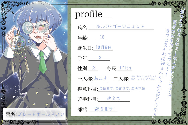 FumiRoom23☆quiet followMENU<詳細> https://privatter.me/page/670e7db111143 恋でもなんでもない、熱に呑まれて失った。グレートオールドワン寮:一年の冬 #CS #設定資料 settingInformation show all(+7 images) Tap to full screen (size:1600x1066).Repost is prohibited Let's send reactions! freqpopularsnackothersPayment processing Replies from the creator Follow creator you care about!☆quiet follow FumiRoom23DONE【おかしなことを】本当に、身勝手な人たち…… 2 FumiRoom23MOURNING※IF世界になった物達※SS https://privatter.me/page/6703f33fbfa2e 30 FumiRoom23MENU◆ルルワご依頼アイテム一覧1:万くんへ指輪2:マルガリータちゃんへコサージュ随時更新 2 FumiRoom23PAST◆ ひとり、 ◆ ──くそったれ 2 FumiRoom23PAST◆ 神について ◆ 興味、湧いたみたいだな。 3 FumiRoom23PAST◆ 賛美歌 ◆ 捧ぐはかつての”愛”の歌 2 related works 八岐蛇尾PASTタグ等でデザインだけしたけど今のところどこの創作にも属せていないキャラ達 9 volke.DOODLEうちの子『ヘルミーネ・トレーガー』ちゃん初期の設定資料絵その1です♪#うちの子 #ヘルミーネ・トレーガー #オリジナル #オリキャラ #創作 #創作キャラ #設定 #設定資料 #義手 #パワードタイツ #パンツァープッペ ぬるをDONEななくろ紹介キャラシななおくんはあづま先生が描いてくれました(@azumaoh_) 八岐蛇尾DOODLEクウロと葉栗(狛Aのすがた)のデザインメモ 4 SNosophiliaMEMO鎖和さんビジュアルデータ。良ければ描いてくれ。 2 ぬるをMEMOうちのこメモ① volke.DOODLEうちの子『ヘルミーネ・トレーガー』ちゃん初期の設定資料絵その2、その3です♪#うちの子 #ヘルミーネ・トレーガー #オリジナル #オリキャラ #創作 #創作キャラ #設定 #設定資料 #義手 #パワードタイツ #パンツァープッペ 2 conacadreamMEMO私宅創作審神者さんの設定らしきもの。創作審神者テンプレートをお借りしました。かなり見づらい&汚いですが、気になる方はどうぞ!【パスワード:私宅審神者の名前を半角英字で入力してください】※あくまで創作審神者の設定であり、普段のしもやけのプレイイングによるダメダメな部分はほとんど排除したものを記入しております! 2 北条氏傍MEMOオリジナルキャラクターの設定画。女子編 5 recommended works るんこBLANK今度の漫画の主人公女の子やから私の事知ってる人は目ん玉飛び出るんちゃうか。 いさおだよDONE ##ロージー ##CS 5 いさおだよDONE ##龍雲 ##CS 6 いさおだよDONEバニラとアイス♪ 4 ぬるをMEMOうちのこメモ① higurekikakuMEMO南北誠仙狐1年生(14-15)詠手 18 7254_MUMEIPAST🐶ポーラまとめ リカ学@lycanthropy_s 9 鴨杖もよDONE[Sexia: ***memory]山峰 霧馬(やまみね きりま)オリジナルシリーズ、Sexia: *** memoryのサブキャライラストです😊設定は後から変更があるかもしれませんが、ブログに一部公開していますので興味がある方がいましたら見てみてください🌿霧馬の設定: http://moyomoyo2.blog.fc2.com/blog-entry-6518.html 豆球ちゃん🌿💀🌿💐🦼PAST*病弱の願い 2