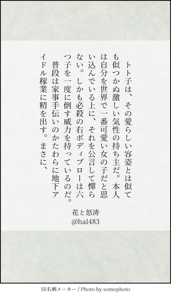 高間晴☆quiet followDONE映画タイトルで100の挑戦(日本映画編)⑩http://cinema100de.gozaru.jp/SS名刺10枚。腐要素はありません。改行・スペース、タイトル等除いて全て140文字です。 #おそ松さん theLatePineTree #SS名刺メーカー ssBusinessCardMaker ##SS show all(+9 images) Tap to full screen (size:550x950).Repost is prohibited Let's send reactions! freqpopularsnackothersPayment processing Replies from the creator Follow creator you care about!☆quiet follow 高間晴MOURNING140字敦太。 10 高間晴DOODLE敦太R18pass:18↑?すけべどうやったら描けるねん…… 高間晴DOODLE普段すけべを描かない人間の精一杯の敦太すけべpass:18↑? 高間晴DOODLE敦太すけべらくがきpass:18↑? 高間晴PAST過去の文スト短歌。カップリングとかはなんでもありのカオス。 40 高間晴DOODLE接吻せい……の心持ちで描いた related works 高間晴DONEチョロおそSS名刺5枚。http://neko2.net/yubi5/「ふれあうひとに6」をお借りしました。 5 高間晴DONE映画タイトルで100の挑戦(日本映画編)③http://cinema100de.gozaru.jp/SS名刺10枚。腐要素はありません。改行・スペース、タイトル等除いて全て140文字です。 10 高間晴DONE映画タイトルで100の挑戦(日本映画編)②http://cinema100de.gozaru.jp/SS名刺10枚。腐要素はありません。改行・スペース、タイトル等除いて全て140文字です。 10 高間晴DONE映画タイトルで100の挑戦(日本映画編)④http://cinema100de.gozaru.jp/SS名刺10枚。腐要素はありませんがアニメ本編程度の下ネタは含みます。改行・スペース、タイトル等除いて全て140文字です。 10 高間晴DONE「微エロ妄想さんに100のお題」http://2style.jp/sui/nem/100_attention.htmlチョロおそ。100のお題から5本厳選しました。全文はpixivで読めます→https://www.pixiv.net/novel/show.php?id=12094243 5 高間晴DONEベルギクSS名刺5枚。診断メーカー「○○を使わない140字小説お題」を使わせていただきました。 5 高間晴DONE映画タイトルで100の挑戦(日本映画編)⑥http://cinema100de.gozaru.jp/SS名刺10枚。腐要素はありませんがアニメ本編程度の下ネタを含みます。改行・スペース、タイトル等除いて全て140文字です。 10 高間晴DONE映画タイトルで100の挑戦(日本映画編)⑤http://cinema100de.gozaru.jp/SS名刺10枚。腐要素はありませんがアニメ本編程度の下ネタを含みます。改行・スペース、タイトル等除いて全て140文字です。 10 高間晴DONE映画タイトルで100の挑戦(日本映画編)⑧http://cinema100de.gozaru.jp/SS名刺10枚。腐要素はありません。改行・スペース、タイトル等除いて全て140文字です。 10 recommended works 空木忍DOODLE 空木忍DOODLE「暁のデストロイヤー」「戦うポーカーフェイス」「蝶のように舞い、蜂のように刺す。ブルドーザーのように後には何も残さない」、最強のラヴェンダー大姉上。めっちゃ好きなんですよね…… みずあめDOODLE 9 naoki_osomatsuPAST2016年この頃の方が可愛く陽気に描けてた気がする 高間晴DONEトッティ(ミニスカートのすがた) 高間晴DONE包帯を巻くカラ松 GACHA_gazankaMAIKINGイルミネーション114 途中だけどいったん満足してしまった いつほ/いっちゃん。DONEワンドロの。本当は飛び降りるナギリさんだった… 高間晴DOODLEチェズモク800字。チェがモの遺書を見つけてしまった。 827