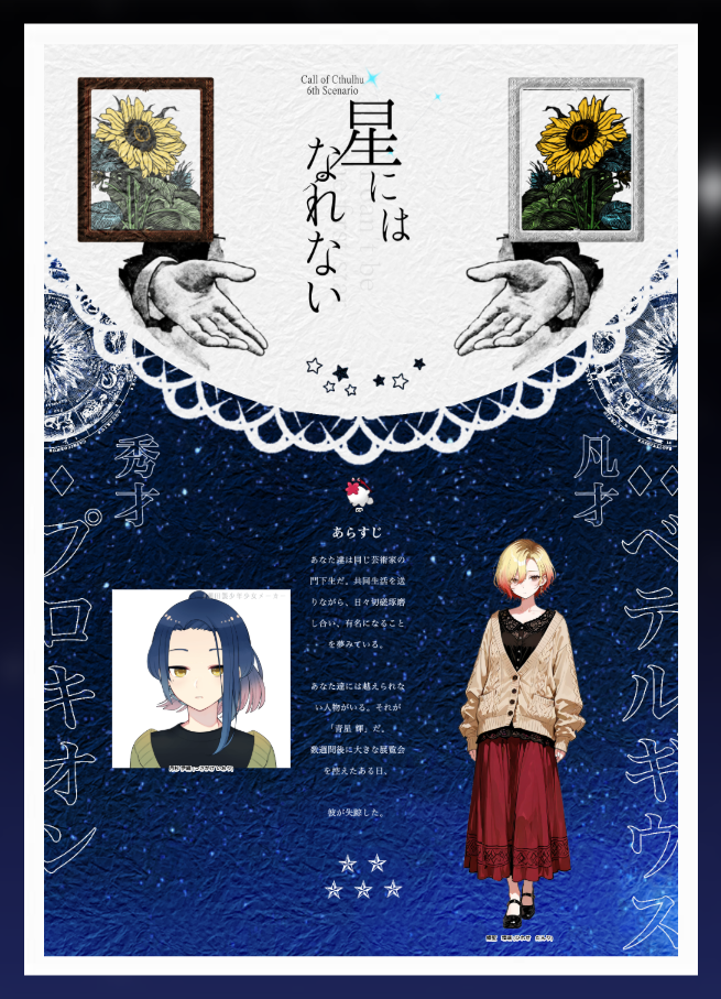 r9reo☆こそフォロメモcoc6《星にはなれない》作:珍品堂様◼︎KP/あるーしお◼︎PC/PLHO1: 月杉 伊織/水無月ちゃんHO2: 鰭聖 壇璃/能面さんEND.1=====いつものお二人?で来ていただきました〜!手綱引きちぎって暴走する壇璃ちゃんと、その顔でヘタレかいの伊織君めちゃくちゃ面白かったです。出目カスは褒め言葉。また遊びに来てくださいね、ありがとうございました〜! タップで全画面(原寸:655x907)無断転載禁止 リアクションをたくさん送って応援しよう! よく使う人気おやつその他支払処理中 作者からのリプライ 気になる人をどんどんフォローしよう!☆こそフォロ r9reoメモcoc6《星にはなれない》作:珍品堂様◼︎KP/あるーしお◼︎PC/PLHO1: 月杉 伊織/水無月ちゃんHO2: 鰭聖 壇璃/能面さんEND.1=====いつものお二人?で来ていただきました〜!手綱引きちぎって暴走する壇璃ちゃんと、その顔でヘタレかいの伊織君めちゃくちゃ面白かったです。出目カスは褒め言葉。また遊びに来てくださいね、ありがとうございました〜! r9reoメモcoc6《邪神のクオリア》作:ろみろみ亭様◼︎KP:あんでぃさん◼︎PL/PCHO1 白海 海姫 / とまとさんHO2 斎宮 秀悟 / isagoさんHO3 神志名 朔 / あるーしおHO4 傘下 露葉 / ひとはさん▶︎END-B 全生還====全生還できると思わなかったし、継続行ける雰囲気もあるのびっくりです。ほんまありがとうございます。今後も後方腕組みします! r9reoメモcoc6《爛爛-二人のための間奏曲-The lost song》作:つきめぐり様◼︎KP/さくさん◼︎PL/PC リンクスさん/geistiges höhle あるーしお /Ruvui▶︎両生還=====相変わらずの二人でした〜!容姿APP18/お行儀APP3のほに。冬でもへそ出しコーデ、出目悪くて転けまくったの解釈一致、ツラがいいで何もかも許されるYO☆BIG LOVE😚 r9reoメモcoc6《ブラッドレッド・インザハイツ》作:花咲かはうす様◼︎KPC/KP 調香師/MJさん◼︎PC/PL 納棺師/🍄▶︎ENDA-1 両生還=====調香師とも継続2作目行ってきた〜!メロすぎて情緒大荒れしてたよPL。とんでもねぇ激重感情爆撃食らってhappy♥️めちゃくちゃ好き〜!納棺師も満更じゃないのがな……は〜、これがクソデカの味か〜!ありがとうございました😚 r9reoメモcoc6《悠遠からのmayday》作:はなむけ屋様◼︎KP:ねむたんさん◼︎PC/PL 生越 駕矩 /あーにゃんさん 樋口 菖 /🍄 五十嵐 火華 /ねむたんさん 花守 典子 /りーさん▶︎END.1=====リリリバ箱継続〜✌️なんだかんだバランスはいいと思うんすよね…このメンツ。みんな違うから。生還できてよかった。今度誘わせて下さい♥️ r9reoメモcoc6《君はきかないから》作:海ひつじ屋様◼︎KP/KPCあーにゃんさん / 緊縛師◼︎PL/PCあるーしお / 納棺師▶︎END.A=====緊縛師と連続継続!2作目やね😚今回は振り回されたというか、振り回されに行った感じするわね。胸キュンが何回かあって死ぬかと思ったPLが。なんだろ?クワロマンティックって言われてるやつ?何だこの感情、納棺師オマエなに? おすすめ作品 tokohana88らくがき 2 MUYAN230623らくがき 4085 天鬼創月メモリアライズ3話制作分 7 agoro___らくがき Yogase621供養大変申し訳ございませんでした無配の全容になります 8 守屋(もりや)らくがき当初書こうと思ってた内容からズレた気がしますが、せっかくなので供養…。劇中劇の事を絡めた話書いてみたいなー、っていう出来心でした!ごめんなさい! 4467 huwa_toroらくがきぷすジェの擬人化です 思いの外ふわりのド性癖男になってしまった後ろは刈り上げです TRPGarukuyoらくがき四季送り秋 ネタバレあり通過済み? きゃびできた