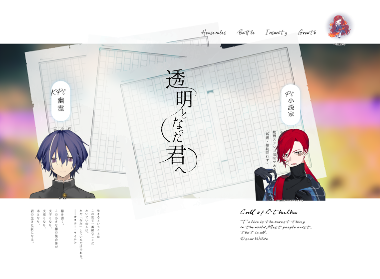 夜太𓁣☆quiet followINFOCoC_6th 報告. 『透明となった君へ』橘 紫苑 /たちばな しおん芥川 侑介 /あくたがわ ゆうすけ──シナリオクリア.生還.青い空に柔い風が吹くとき、また思い出すだろう。 ##夜烏_卓報告 Tap to full screen (size:761x559).Repost is prohibited Let's send reactions! freqpopularsnackothersPayment processing Replies from the creator Follow creator you care about!☆quiet follow 夜太𓁣INFOCoC_6th 報告. 『CIQ 〜 KPC in the サボテン 〜』矢吹 Hemero 寛三 /やぶ へめろ かんぞうPetit-Circulus /プティ キルクルス──シナリオクリア.「天才たるボクにかかれば、だよね!!!!」 夜太𓁣INFOCoC_6th 報告. 『摂氏三十六度のリュミエール』坂井 カナメ /さかいビーチェ・ビスカルディーニ・花筏 /はないかだ──ENDA.シナリオクリア🌸継続プラネタリウムデート🪐🪐🪐 夜太𓁣INFOCoC_6th 報告. 『美術館ホラーRTA』鹿野 ルアン /しかの──ENDA.生還.「今度はひとりで帰ってね」 夜太𓁣INFOCoC_6th 報告. 『でかいハムとKPCが家にきた』呻屋 まつ /うなりやPaeon・M /パイエオン マエストロ──ENDA.シナリオクリア.「はむ……すた……!?」 夜太𓁣INFOCoC_6th 報告. 『宝石を食む』Rufus-Kyle・Elliot /ルーファス カイル エリオットRaguel-Adnan-Al Fayed /ラグエル アドナン アル ファイド──END1.両生還.「君だけが、僕の愛だ」 夜太𓁣INFOCoC_6th 報告. 『静かの船より』Raguel-Adnan-Al Fayed /ラグエル アドナン アル ファイドRufus-Kyle・Elliot /ルーファス カイル エリオット──END.A.両生還.見上げた星に貴方がいることを願って。 recommended works A·GDOODLE强♂制♂口♂交♂ 2 Few__2516DOODLEStanxeno18⬆️ yes/no 4 白色海章鱼DOODLE【代发】类司万圣24h 11:00 万能出汁SPOILER #ライ書店へようこそ ネタバレ有 好きなシーン watarunrun1016DONE上目遣いむずかった,, gura_cubeDOODLECall of Cthulhu「水天一碧を朝凪でのぞむ。」from:カペラとテディベア🧸HO境界線:長尾颯馬/せんべHO存在:大神愛育/ルーク(敬称略)KP:ぐらEND-5やっぱりすいなぎって…すいなぎって… kijinDONEデミアイ 3 麻生陸DOODLEモブとイデアの漫画(1枚) ありご糖❄️🍑PROGRESS12/15 新刊予定だった、新旧リバレサンドの未完成原稿 26