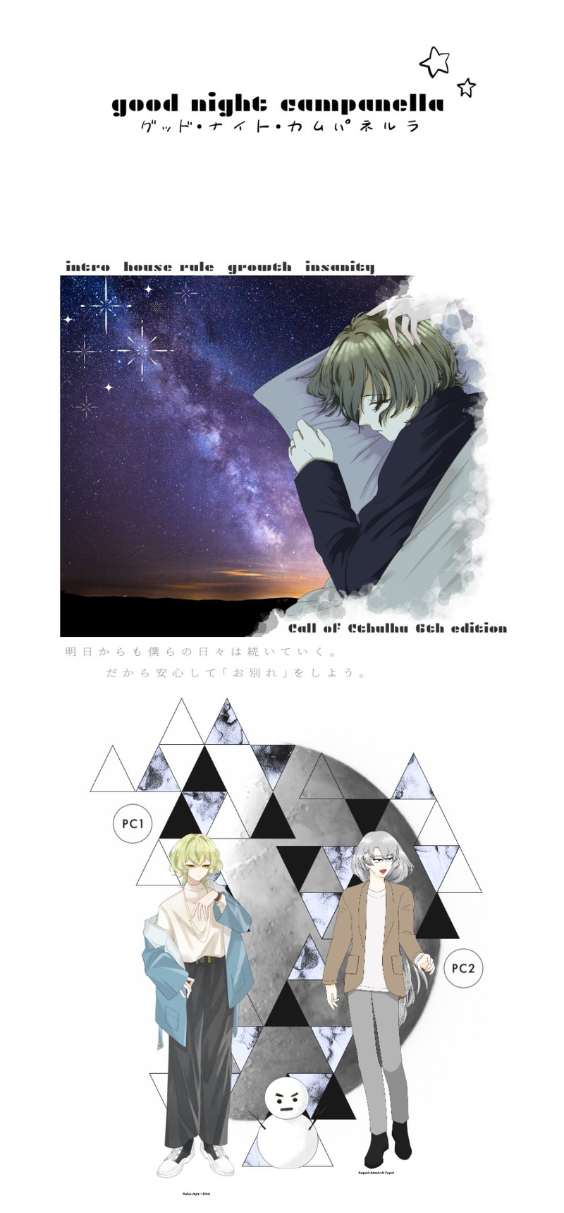 夜太𓁣☆quiet followINFOCoC_6th 報告. 『グッド・ナイト・カムパネルラ』Rufus-Kyle・Elliot /ルーファス カイル エリオットRaguel-Adnan-Al Fayed /ラグエル アドナン アル ファイド──シナリオクリア.本年最後のラグルー、最高だった…… ##夜烏_卓報告 ##ラグルー継続報告 Tap to full screen (size:900x1933).Repost is prohibited Let's send reactions! freqpopularsnackothersPayment processing Replies from the creator Follow creator you care about!☆quiet follow 夜太𓁣INFOCoC_6th 報告. 『グッド・ナイト・カムパネルラ』Rufus-Kyle・Elliot /ルーファス カイル エリオットRaguel-Adnan-Al Fayed /ラグエル アドナン アル ファイド──シナリオクリア.本年最後のラグルー、最高だった…… 夜太𓁣INFOCoC_6th 報告. 『LAST LUST !』한 주은 /ハン ジュウンRegulus-von-Mitternacht /レグルス フォン ミッターナハト──END.2-A.両生還🌸「さあ、お嬢さん。これからも、お手をどうぞ」 2 夜太𓁣INFOCoC_6th 報告. 『不運で幸運な君と歩く』Rufus-Kyle・Elliot /ルーファス カイル エリオットRaguel-Adnan-Al Fayed /ラグエル アドナン アル ファイド──END1.両生還.「ああそうだ、ルー君。──おはよう!」 夜太𓁣INFOCoC_6th 報告. 『タナトスは死に何を想う』KP:香月紫華雨 雲雀 /しかう ひばり玉章 小雀 /たまずさ こすずめ──END.H.両ロスト.「貴方となら、どうなっても幸せ」 夜太𓁣INFOCoC_6th 報告. 『お願い、グレーテル』兜森 理 /かぶもり おさむAzoth-Trismegistus-Arcanum /アゾット トリスメギストス アルカヌム──END1.両生還🌸「甘いものはもう結構」 夜太𓁣INFOCoC_6th 報告. 『GOZARCA』──10生還.14ロスト.良い月を、かけがえのない夜を、雨が止むまで。 2 recommended works birdsofpasssageTRAININGleon re4r - old practicestill searching for the original poster/creator of the reference pic ..... (T_T) 2 AritoyaCAN’T MAKE 2 trpg_kanshiinuDOODLE都市伝説解体センター 最終章の致命的なネタバレがあります、未プレイの方は閲覧しないようお願いします。 2 Octocomics-BLDOODLE namasugirigiriDOODLE🔮リョナ?モザイクに逃げました🙇 amore_mio1111MAIKING成長魔法の失敗か魔道王のお薬かで身体も精神もショタになったウルを喰っちゃう(概念)悪いえっちなお姉さん(概念)アークの話。えろいとこは書き上がっているから後は肉付けだけなんだけど他に書かないといけないのがあるので後回し中… 24 よちよちよDOODLE「Project smiley」「花冷えに亡く季節」現行未通過閲覧禁止です 8 7ok7_4DONE決戦!九龍城砦 kontyan_trpgDOODLEホテセン現行未通過❌自陣❌らくがき置き場その②⚠️一部トレス素材お借りしております 14