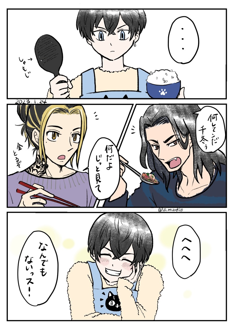 味付けがおかしかっただろうかと、千冬は場地の顔を見る。今日は一虎は女の子とハロウィンパーティーに行くと言ってこちらには来ていないので、久しぶりに場地と二人の食卓だ。