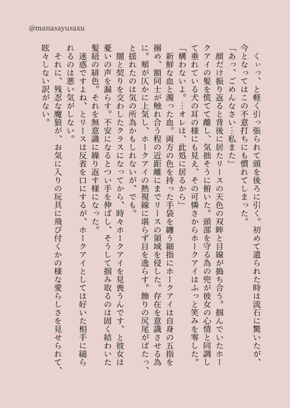 さぅ。☆quiet followDOODLEナイトブレード×フェンリルナイト的な何か。 ##ホークリ Tap to full screen (size:568x800).Repost is prohibited さぅ。DOODLE2025書き初めホークリ。お酒を飲むフェンリルナイトとこのホークアイのクラスはどっちアンケートした結果。ブルームーンのカクテル言葉は「完全なる愛」と「叶わぬ恋」の2つがあるというトコから最後の一文を入れてる(言うの野暮だけど言っちゃう)なんかこの両方の言葉がホークリっぽいなと思っちゃった。 4 さぅ。DOODLE※ネタバレ含みます※p1-2:レナスの祭壇へ向かうヴァルヒナちゃん妄想p3-4:ただの叫びと言い訳とか 4 さぅ。DOODLEToM4周年用に…と思って書き始めた未来捏造。申し訳程度のケヴィシャル風味。 6 さぅ。DOODLEワンドロライまとめ1-3: 「逃げる」リースOP4-7:「女主人公(LoM)」「食卓」8-12:「ダッフル」「ラルク」「涙」 12 さぅ。DOODLEホークリ1-4:火炎の谷後のエルランド5:ワンドロライより 鳥/ハグ 5 さぅ。DOODLE晴←景っぽい何か 2