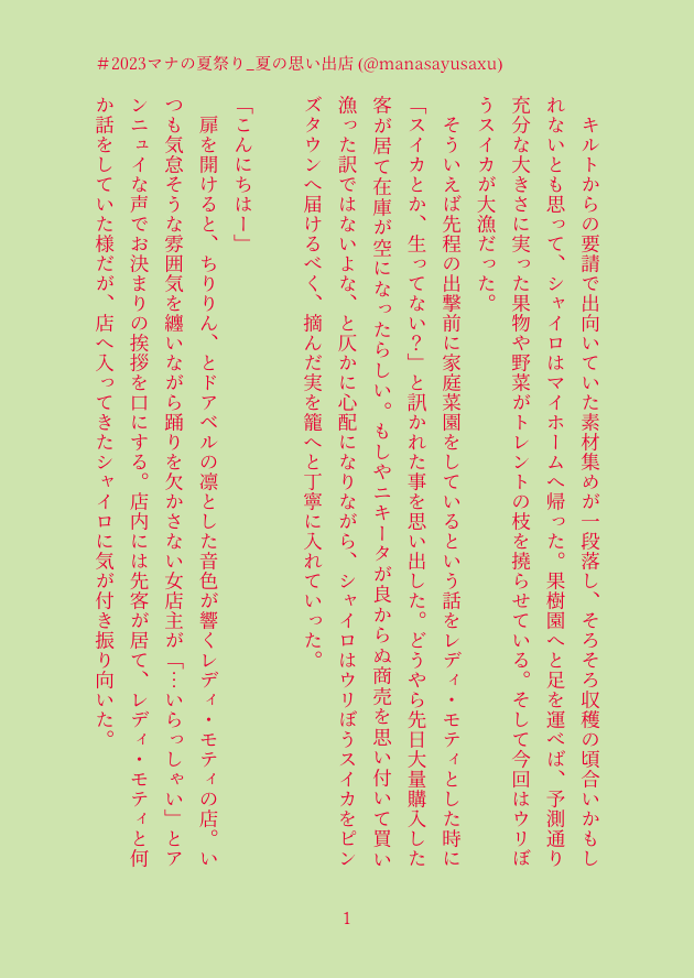 さぅ。☆quiet followDONE1-4:夏のタグ企画に参加した時の、エコマナ軸のシャイロとセラフィナの話。5-10:マナの新緑祭に参加した時のエバデナ。 show all(+9 images) Tap to full screen (size:630x888).Repost is prohibited さぅ。DOODLE2025書き初めホークリ。お酒を飲むフェンリルナイトとこのホークアイのクラスはどっちアンケートした結果。ブルームーンのカクテル言葉は「完全なる愛」と「叶わぬ恋」の2つがあるというトコから最後の一文を入れてる(言うの野暮だけど言っちゃう)なんかこの両方の言葉がホークリっぽいなと思っちゃった。 4 さぅ。DOODLE※ネタバレ含みます※p1-2:レナスの祭壇へ向かうヴァルヒナちゃん妄想p3-4:ただの叫びと言い訳とか 4 さぅ。DOODLEToM4周年用に…と思って書き始めた未来捏造。申し訳程度のケヴィシャル風味。 6 さぅ。DOODLEワンドロライまとめ1-3: 「逃げる」リースOP4-7:「女主人公(LoM)」「食卓」8-12:「ダッフル」「ラルク」「涙」 12 さぅ。DOODLEホークリ1-4:火炎の谷後のエルランド5:ワンドロライより 鳥/ハグ 5 さぅ。DOODLE晴←景っぽい何か 2 recommended works がっつ@聖剣3DOODLE【学パロらくがきまんが学生にしては大人びた2人まとめ】ホークリ+エリオットでずっと描きたかったもの。全10頁まとめて読めます。ラブラブでち🤭 10 がっつ@聖剣3DOODLE【フォロワさんに引用RTで思い出語って頂いたお礼シリーズ】(前半)カプ、ジャンル雑多!15枚あります!この果報者★ 15 こま@リハビリ中PASTバレンタイン過去絵@聖剣3の主人公3組どれも美味しいですもぐもぐ 🦐結🍤MOURNING温泉街旅行? 5 みい(み)Reuse Christmas2022.12Happy Holidays🎄🌟🌟 碌ノ瀬DOODLEI feel it in my bonesYeah I think lve always known it would end like this…の歌詞が好きで急に書きたくなってしまって…などと供述しており流石に新年にお出しするイラストじゃないよな!?!?になり何とか年内に終わらせようと一日でここまで進めた、少しは筆が早くなったんじゃないか?それはそれとして流石に目が慣れてきてしまい違和感に気づけなさそうなので一旦寝 高津御杯DOODLEでんじゃらすび〜すと長こへ♀⚠️女体化女装注意⚠️本当に、本当に人を選ぶ落書きなので、よく考えてパスを入力してね!🔑=y/n 2 らるるDOODLE騙すつもりが絆されて4にて掲載させて頂いた漫画その2 ヴィラヴィラ編 9 wkrmsDOODLEシスネハ♀ 迷思+妄想(日語下手 2