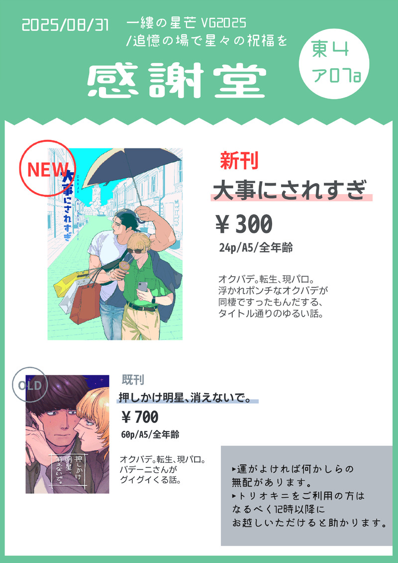 日照り☆quiet followMENU25/8/278/31一縷の星芒 VG2025のお品書きです。よろしくお願いします。新刊サンプル→https://poipiku.com/10912608/12086607.html既刊サンプル→https://poipiku.com/10912608/11606353.html show all(+1 images) Tap to full screen (size:2482x3509).Repost is prohibited Let's send reactions! freqpopularsnackothersPayment processing Replies from the creator Follow creator you care about!☆quiet follow 日照りDOODLE25/10/23オクバデlog⑨ 13 日照りMOURNING25/9/4イベントお疲れ様でした。当日配布予定で間に合わなかった無配です。一応新刊と同軸のオクバデですが内容は全然関係ないです。 4 日照りMENU25/8/278/31一縷の星芒 VG2025のお品書きです。よろしくお願いします。新刊サンプル→https://poipiku.com/10912608/12086607.html既刊サンプル→https://poipiku.com/10912608/11606353.html 2 日照りINFO25/8/168/31一縷の星芒のサンプルです。全年齢/24p/A5/300円浮かれポンチなオクバデが同棲ですったもんだする、タイトル通りのゆるい話。【東4ア07a/感謝堂】部数アンケートにご協力いただけますと非常に助かります→https://x.gd/KPEfPd🐯通販→https://x.gd/qjYvf 9 日照りDOODLE25/6/21 オクバデ等log⑧転生現パロ攻めの捏造オカンが出ます 15 日照りMOURNING25/5/3本日はスパコミお疲れ様でした。本と無関係な無配のオクバデと、差し入れに付けようと思ったけど用意が間に合わなかったやつです。スペースへお越しくださった方、差し入れをくださった方、皆様ありがとうございました。新刊通販はこちら→https://ecs.toranoana.jp/joshi/ec/item/040031233345/ 2 recommended works syako_km2TRAININGむざこく30本ノック5日目 2064 ゆきおみDOODLE極の山崎さん、仕事のあと興奮しすぎて夜這いしてきそうなタイプだと思うんだよね…へへへ… 碳烤腰果煎饼DOODLE■新人制服为什么是女仆装啊! 神秘的彭格列城堡里有着数不尽的财宝、站于巅峰的强者以及这个世界的秘密,引得无数人趋之若鹜。然而城堡只允许彭格列的成员进入,非彭格列成员踏入城堡会被消灭。 所以,谁能告诉他们为什么一进去身上的衣服就变了,还不能换??? 现任彭格列城堡之主Giotto:嘻嘻。 埋在文件堆内的管家G:在达到特定条件前脱不掉的,辞职也没用。反正不过是件衣服,穿着穿着就习惯了。 4 山芋かしりべDONEオクバデR18 未成年閲覧禁止乳首を吸引しながら手マンをする話すけべな脳内スケッチ、初稿※支部の「シ。」の続きですが、手マンしてるだけなので、読んでなくても全く問題ありません 7347 usamimi_sacchanDOODLEオクバデ逃亡if 7 akichDOODLEVezalina nsfw art :3c 梨花梨花DOODLE 3 鶏(とり)DOODLE🍔「君も家を飛び出したらどうだい!」アルマシュ patchy_morDOODLE🐍: ปลุกข้ามาทำไม⚡️: ลูกเราหนาวจนจะแย่แล้ว ทำไมเจ้าไม่กกไข่🐍: นี่เจ้ากำลังพูดแบบนั้นกับคนที่ไม่ได้นอนทั้งคืนเพราะเจ้างั้นเหรอ ซูซาโนะโอะ 2