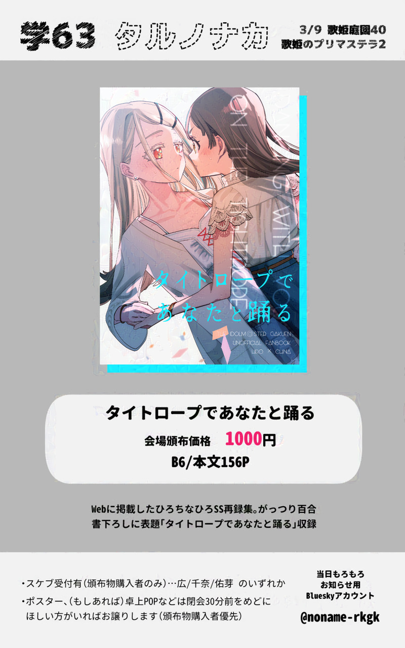 NOname☆quiet followMENU【学63】3/9開催 歌姫庭園40/歌姫のプリマステラ2 お品書きひろちなひろSS再録本を頒布します。サークル名【タルノナカ】当日はどうぞよろしくお願いいたします。 #歌姫庭園40 #歌姫のプリマステラ2 ##ひろちな ##ちなひろ Tap to full screen (size:840x1344).Repost is prohibited Let's send reactions! freqpopularsnackothersPayment processing Replies from the creator Follow creator you care about!☆quiet follow NOnameMEMO頒布予定の新刊、写真が下手すぎですが、実物はこういう感じです。ブックカバー+遊び紙+表紙全面箔次いつこういう機会があるかも分からないので、やってみたかったことの内のいくつかを試してみました。「本文を開いたらヴィンテージゴールドの遊び紙」+「カバーの下にはアクアマリン全面箔」で自分なりの何かしらを込めた装丁です。 3 NOnameMENU【学63】3/9開催 歌姫庭園40/歌姫のプリマステラ2 お品書きひろちなひろSS再録本を頒布します。サークル名【タルノナカ】当日はどうぞよろしくお願いいたします。 NOnameINFO3/9開催、歌姫40内開催の「歌姫のプリマステラ2」にて頒布するひろちなひろSS再録本の表紙です。 NOnameINFO 154 NOnameINFO歌姫庭園40申込サクカ サークル名「タルノナカ」Web再録ひろちなひろSS本書き下ろし15000字~20000字くらいの予定です※(※「蟷螂の斧、わたしたちの闘争」の後日談) related works べこDOODLEピンク色のバレンタインなヨウグズ🍫 ちゃづDONE描いたやつその1※茨あん、ジュンあん 17 2watoyoDOODLE【朝のボールペン落書き】【日楠♀】【先天性女体化】日高先輩×男装後輩サキュバス家系楠ちゃん。海編。本当に気にしてるのは。 ココノカSPOILER幻覚なので全くネタバレではないけど1072話の発言ネタ きくちゃんDOODLEサタン様犬好きかと思いきやロクサーンみたいなパターンもあるのでやっぱ人外思考なのかな~ nnnnnnoodderaDONE【腐向け】チャバが酔ってハ崎さんに甘えてる漫画。ハ崎さんがトイレに行くのを我慢していたりする。 4 ちゃづDONE描いたやつその1※茨あん、ジュンあん 17 わたさくDOODLE きくちゃんDOODLEサタン様犬好きかと思いきやロクサーンみたいなパターンもあるのでやっぱ人外思考なのかな~ recommended works 碳烤腰果煎饼DOODLE■新人制服为什么是女仆装啊! 神秘的彭格列城堡里有着数不尽的财宝、站于巅峰的强者以及这个世界的秘密,引得无数人趋之若鹜。然而城堡只允许彭格列的成员进入,非彭格列成员踏入城堡会被消灭。 所以,谁能告诉他们为什么一进去身上的衣服就变了,还不能换??? 现任彭格列城堡之主Giotto:嘻嘻。 埋在文件堆内的管家G:在达到特定条件前脱不掉的,辞职也没用。反正不过是件衣服,穿着穿着就习惯了。 4 ゆずはPROGRESSファ◯マコラボのやつ mznnknirDONE誰デザまとめ 5 すいーDOODLE【あんスタ】①まとめ2024/4〜2025/1 12 宮田カヨ(ほうせんか)SPUR ME監督生が男か女かわからなくなったマブの話 3 しいなDOODLEいわひらHO2両目を供養 にっっくにくPROGRESSこつこつ ののめPAST100日チャレンジまとめ過去絵が恥ずかしすぎて辛いです。 100 Jvz3FDOODLEしんでなんかないよ現行未通過❌ スチル 8