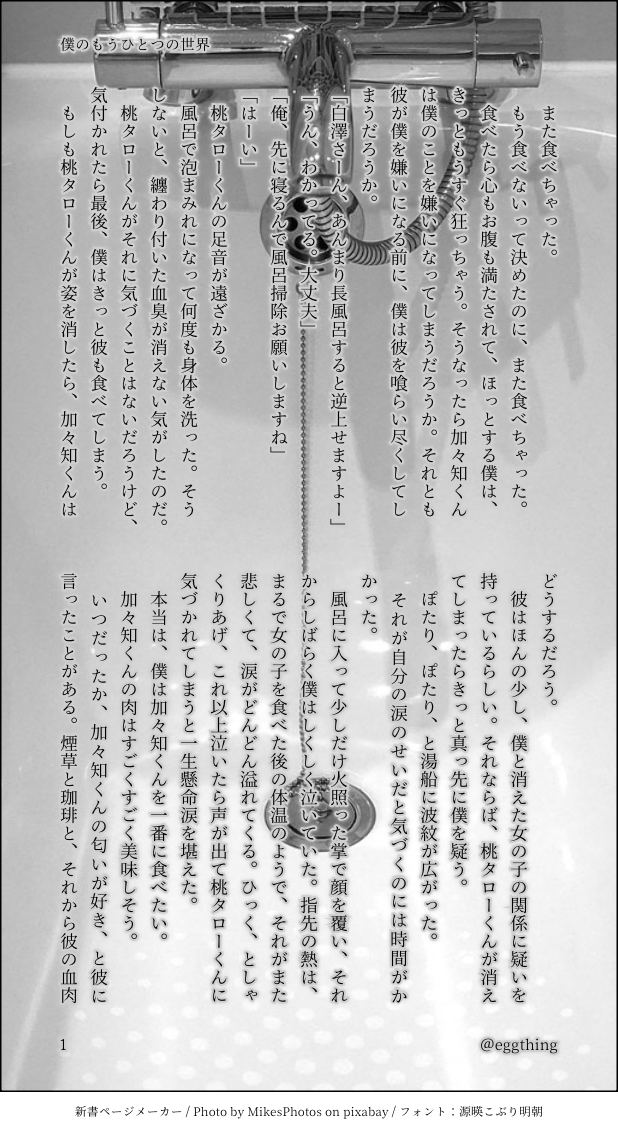 eggthing504☆quiet followMOURNING支部に投稿している元人魚の白澤さんの話「僕の世界」の別ルート。盛大なネタバレ。書いたもののこのルートでは話がまとまらずメモに残したままになっていたのでお焚き上げ。人魚シリーズ(加々知さんバージョン、白澤さんバージョン)どちらもお気に入りなのでよかったら見てもらえたら喜びます show all(+1 images) Tap to full screen (size:618x1132).Repost is prohibited Let's send reactions! freqpopularsnackothersPayment processing Replies from the creator Follow creator you care about!☆quiet follow eggthing504MOURNINGひとつ前のテキスト投稿したお焚き上げSSが、閲覧できないのでは?!ということで画像であげてみました! 2 eggthing504DOODLE支部に載せている「別れても好きな人」https://www.pixiv.net/novel/show.php?id=13914230の最初に書いていた分岐点。収拾がつかなくなり途中で断念して支部に載せてる形に変わりました 1356 eggthing504DOODLE(赤と黒)倫理観が壊れてる(善悪の判断ができない)殺し屋さんな白澤さんの話。地獄(仮)のマフィアに狙われてたりします。加々知さんは白澤さんの元の仕事(殺し屋)については把握済み。余談ですが最初の悲鳴は白澤さんが男の性器を食い千切った結果の悲鳴。 3 eggthing504DOODLE自分は唯一で番もいないので、妊娠だってできちゃうゾ!と思い込んで、鬼様を振り回す白澤さんの話(勿論できない)冒頭なので、まだ妊娠云々まだ出てこないけど既にちょっと振り回されてる。そのうちいつか完成する日がくるかもしれない。 3 eggthing504DOODLE(赤と黒)善悪の判断できなかったりとか倫理観が壊れてたりする白澤さんをひたすら書き続けている話の一部 2 eggthing504MOURNING夏の果て「半夏生」の一部。「春立つ」ラスト直後の帰宅のシーン。 2709 recommended works ¥つまDONEこれは朝家を出る前に殴り合いの喧嘩をする善獪善です私の性癖にしか配慮していません!! Matsunaga_bsrDOODLEインセデ現行未通過× まだ見ぬあなたに会いたくて 鬼忍者可愛いDOODLE⚠男型ふたなり 腐向け R18 ⚠男型のふたなりクレナイ君妄想するのも好き♡女の子で愛されるとよすぎて理性とばしてたらいいわ~♪潮吹きとまらないし相手も止めてくれなくっておいつめられててほしい!! 猫のしっぽDONE茶柱さん誕生日おめでとう!🎂これからもよろしく! おこたDOODLE前の投稿の妄想会話です。こちら文章です。#サンナミ 4 sumnkenDOODLEpast works. 1st img: 5s + tentacles 2nd img: 5s x echo 2 NikupometaroSPOILER卓報告「エデンハルシネーション」 hxp147258DOODLEエムシーエム欧米風カード収納iphone16/15カバーhttps://foolcase.com/goods-mcm-iphone-15promax-case-236.html まいたけ天ぷらINFO2025/1/12新刊R18部分のサンプルです