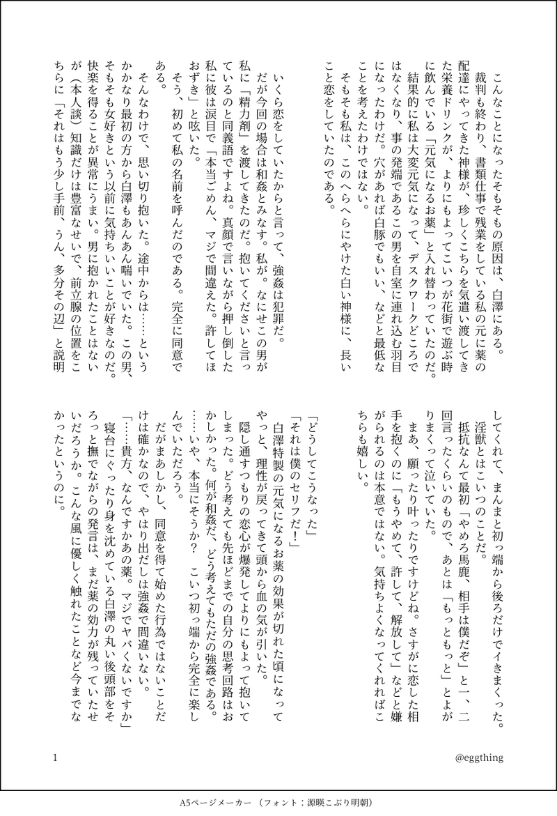 eggthing504☆quiet followDOODLE自分は唯一で番もいないので、妊娠だってできちゃうゾ!と思い込んで、鬼様を振り回す白澤さんの話(勿論できない)冒頭なので、まだ妊娠云々まだ出てこないけど既にちょっと振り回されてる。そのうちいつか完成する日がくるかもしれない。 show all(+2 images) Tap to full screen (size:888x1300).Repost is prohibited Let's send reactions! freqpopularsnackothersPayment processing Replies from the creator Follow creator you care about!☆quiet follow eggthing504MOURNINGひとつ前のテキスト投稿したお焚き上げSSが、閲覧できないのでは?!ということで画像であげてみました! 2 eggthing504DOODLE支部に載せている「別れても好きな人」https://www.pixiv.net/novel/show.php?id=13914230の最初に書いていた分岐点。収拾がつかなくなり途中で断念して支部に載せてる形に変わりました 1356 eggthing504DOODLE(赤と黒)倫理観が壊れてる(善悪の判断ができない)殺し屋さんな白澤さんの話。地獄(仮)のマフィアに狙われてたりします。加々知さんは白澤さんの元の仕事(殺し屋)については把握済み。余談ですが最初の悲鳴は白澤さんが男の性器を食い千切った結果の悲鳴。 3 eggthing504DOODLE自分は唯一で番もいないので、妊娠だってできちゃうゾ!と思い込んで、鬼様を振り回す白澤さんの話(勿論できない)冒頭なので、まだ妊娠云々まだ出てこないけど既にちょっと振り回されてる。そのうちいつか完成する日がくるかもしれない。 3 eggthing504DOODLE(赤と黒)善悪の判断できなかったりとか倫理観が壊れてたりする白澤さんをひたすら書き続けている話の一部 2 eggthing504MOURNING夏の果て「半夏生」の一部。「春立つ」ラスト直後の帰宅のシーン。 2709