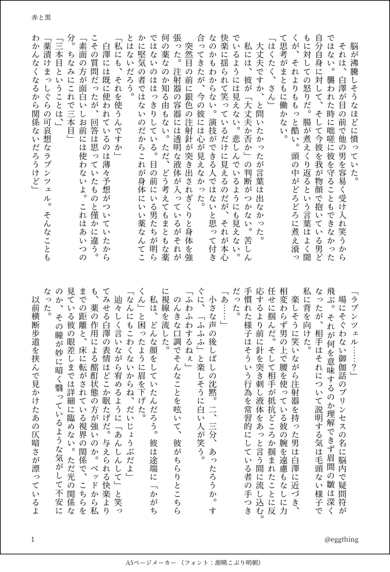 eggthing504☆quiet followDOODLE(赤と黒)倫理観が壊れてる(善悪の判断ができない)殺し屋さんな白澤さんの話。地獄(仮)のマフィアに狙われてたりします。加々知さんは白澤さんの元の仕事(殺し屋)については把握済み。余談ですが最初の悲鳴は白澤さんが男の性器を食い千切った結果の悲鳴。 show all(+2 images) Tap to full screen (size:888x1300).Repost is prohibited Let's send reactions! freqpopularsnackothersPayment processing Replies from the creator Follow creator you care about!☆quiet follow eggthing504MOURNINGひとつ前のテキスト投稿したお焚き上げSSが、閲覧できないのでは?!ということで画像であげてみました! 2 eggthing504DOODLE支部に載せている「別れても好きな人」https://www.pixiv.net/novel/show.php?id=13914230の最初に書いていた分岐点。収拾がつかなくなり途中で断念して支部に載せてる形に変わりました 1356 eggthing504DOODLE(赤と黒)倫理観が壊れてる(善悪の判断ができない)殺し屋さんな白澤さんの話。地獄(仮)のマフィアに狙われてたりします。加々知さんは白澤さんの元の仕事(殺し屋)については把握済み。余談ですが最初の悲鳴は白澤さんが男の性器を食い千切った結果の悲鳴。 3 eggthing504DOODLE自分は唯一で番もいないので、妊娠だってできちゃうゾ!と思い込んで、鬼様を振り回す白澤さんの話(勿論できない)冒頭なので、まだ妊娠云々まだ出てこないけど既にちょっと振り回されてる。そのうちいつか完成する日がくるかもしれない。 3 eggthing504DOODLE(赤と黒)善悪の判断できなかったりとか倫理観が壊れてたりする白澤さんをひたすら書き続けている話の一部 2 eggthing504MOURNING夏の果て「半夏生」の一部。「春立つ」ラスト直後の帰宅のシーン。 2709