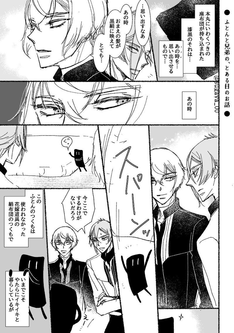 すがや☆quiet followDONEつくものいる弊本丸の、ふとんのつくもの話。8ページ⚠兄×弟。恋仲の兄弟⚠独自設定・独自キャラ活動中⚠もろもろご自衛下さい。何も見えていないですが、するのしたいのとイチャイチャしているのと、自本丸設定内輪話なのでポイピクに。続きものなので前作までを読んでいないと分かりにくいです…。何でも許せる方のみにて、ご自衛をお願いいたします…。 show all(+7 images) Tap to full screen (size:2447x3472).Repost is prohibited すがやPAST⚠髭切×膝丸⚠成人向け⚠未成年は閲覧しないでください⚠諸々自本丸設定。他の男士も出ます。諸々ご自衛推奨です。何でも大丈夫と言う成人の方のみお進みください。パスワード→ hghzfes夏休みだよ!髭膝まんが祭、という素敵なお言葉に便乗させていただき……在庫もなく再版予定もないのでここでお読みいただけたら嬉しいです。 48 すがやDONE⚠髭膝⚠パスワードは次の「千代に想いし愛の源」の開催月日を数字4つで入力してください。 twitter(X)にあげた「腐れ縁とお節介の話」の再録分8pと本用に描いた続き9pです。7月に本にするのでサンプル代わりにまとめました。⚠本丸の他の男士います(鶴〇と兄が腐れ縁設定)⚠独自設定あり⚠閲覧は何でも許せる方のみにてよろしくお願いいたします。⚠AI学習や無断転載は禁止⚠ 18 すがやPASTtwitter(X)にあげた「こもちの日報」シリーズのこれまでの分14p、春に本にするのでサンプル代わりにまとめました。そういう描写はここまではありませんが描いているのは髭膝のニンゲンなのでいずれ髭膝になると思われる兄弟です。⚠独自設定あり⚠審神者㊛出ますただのモブです…⚠閲覧は何でも許せる方のみにてよろしくお願いいたします。 14 すがやDONE集い渡るモノたちの話③「にぎやかな屋敷の話」(つくもの本丸シリーズ「寂しがりの来客の話」「山神の屋敷を訪ねる話」の続き )⚠ヒゲ🦁兄×ヒザ🐍弟(恋仲の兄弟)⚠独自設定独自つくも独自さにわ。ご都合よく色々好きに描いています。何事も諸々ご自衛推奨。何でも許せる方のみにて、よろしくお願いいたします🙇♀️ 14 すがやDONE集い渡るモノの話②「山神の屋敷を訪ねる話」(つくもの本丸シリーズ「寂しがりの来客の話」の続き )⚠ヒゲ🦁兄×ヒザ🐍弟(恋仲の兄弟)⚠独自設定独自つくも独自さにわ。ご都合よく色々好きに描いています。何事も諸々ご自衛推奨。何でも許せる方のみにて、よろしくお願いいたします🙇♀️ 16 すがやDONE集い渡るモノの話①「寂しがりな来客の話」(つくもの本丸シリーズ )8p⚠🦁兄×🐍弟(恋仲の兄弟)⚠独自設定独自つくも独自さにわ。ご都合よくいろいろ好きに描いています。なにごとも諸々ご自衛推奨。何でも許せる方のみにて、よろしくお願いいたします🙇♀️ 8 recommended works yawaraka_fuyodoDOODLEなぞのパロ 阿鹤是迈迈的小卷毛CAN’T MAKE说好的这不就来了,顺便补点设定。多人的时候狗哥也经常在前面,因为看着妹宝因为承受过多kg而哭泣的脸对他来说是最享受的。而小狮子这时候容易嫉妒心作祟,偶尔会失控 POI9897959DOODLE KirimikadoPASTr18稿件展示 11 obake_motiDOODLE⚠️CP混合なので苦手な方は絶対に見ないでください。【順番】タル鍾→万放→カヴェアル→リオヌヴィ→召フリ(召使の♂バージョンあります) 18 0x2471_vDOODLE🎄🎱※スタンプの垢名違いますが本人ですズボラなだけです 肴飯のポイ箱DONEロマンチストな1人と、そうじゃない1人の話。一度は書いてみたかったネタです。良いホリデーをお過ごしください🎄✨🎁 1471 guacatosDOODLE[ hathaway ] 1 pic[ kennehatha ] 2 pics[ kenneth ] 4 picsfrom june and july... 7 抹茶鲸鱼蛋糕DOODLE小纯以为要发生什么了,结果只是亲亲了一晚上,事后还被巴巴告知真正的亲吻是要那样的…… 3202