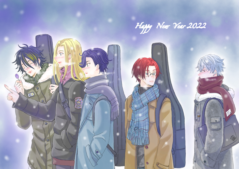 年賀絵何枚か描いたうちの一枚なんですが5人揃ってたので祝い事にのっかります☺️練習帰りに初詣行くか〜ってなったジャイロ、那由多さん気まぐれで付き合うけどお参りはしないの巻。