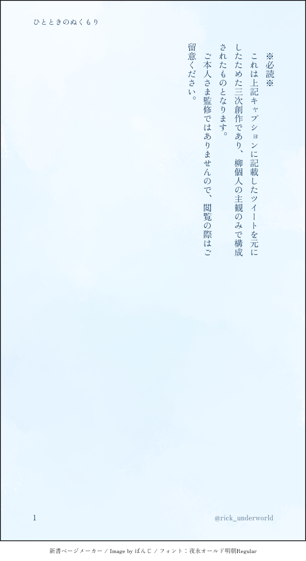 rick_underworld☆quiet followMOURNINGヤン視点。不眠の気配添え。https://twitter.com/solla_ga/status/1842186873747485118?t=D8RzFfNVKyBclpzXjSXXkA&s=19こちらを拝見した瞬間あまりにもツボ過ぎて脳内🌹☕️妄想が止まらず……。空さんに許可を得て、妄想を文字起こしさせていただきました。素敵なReSo🌹☕️をありがとうございました😭🙏✨ show all(+1 images) Tap to full screen (size:618x1132).Repost is prohibited Let's send reactions! freqpopularsnackothersPayment processing Replies from the creator Follow creator you care about!☆quiet follow rick_underworldDONE「事象の地平面(event horizon)」という単語を知ってしまい、これを銀Aで使わずして何処で使うのか……!と、興奮した結果、🌹←☕️が出来上がった次第。 rick_underworldMOURNINGヤン視点。不眠の気配添え。https://twitter.com/solla_ga/status/1842186873747485118?t=D8RzFfNVKyBclpzXjSXXkA&s=19こちらを拝見した瞬間あまりにもツボ過ぎて脳内🌹☕️妄想が止まらず……。空さんに許可を得て、妄想を文字起こしさせていただきました。素敵なReSo🌹☕️をありがとうございました😭🙏✨ 2 rick_underworldDONE #ReSoコプヤンモブ視点。ReSo会におけるみなさまとの会話の中で見えた幻覚。なんの盛り上がりもオチもないけど鉄は熱いうちに打て精神で。モーションかけるのは🌹なのに、☕️にあしらわれてしまう忠犬。このあとベッドの上で反撃するまでがワンセット。 2 rick_underworldDONE #ReSoコプヤン🌹視点。独裁教唆に靡かない☕️をどうにかしたい🌹は、どうにもならない☕️であるからこそ執着している。という妄想。たたかいの駆け引きを上手くやれる☕️が人の機微に鈍いのは、そうでなければいのちある人間を“使う”側でいられないのだろうと、下名は愚考致します。 rick_underworldDONEおめでとう感がまるで感じられないけれどもシェーンコップおめでとうSS。☕️の思考の海の中に、自分の居場所があるのならそれだけでいい。そんな自称無欲な男であってもいい。 rick_underworldDONE🌹2024/02/28🌹🌹イゼルローン攻略[後編]TV放送記念🌹「信じる」と言ったあなたを信じる。 2 recommended works かほる(輝海)DONE貴方はかほるさんちの獠で『足して割って、ちょうど』をお題にして140文字SSを書いてください。#shindanmakerhttps://shindanmaker.com/375517原作以上の関係。寒い朝はこんな二人もいいね(*´艸`*) こよみTRAININGこよみんちの獠香で「硝煙」と「パーティー」のお話はどうでしょう? 9ツイート(1260字)程度だと嬉しいですっ!#CHしたったー #shindanmakerhttps://t.co/pVfxz10Cptかほるさんのご提案で作った診断メーカー。書きましたよ!珍しくこの量を2時間くらいで書きました。恋人関係の獠香です♥楽しんでいただければ幸いです。 3 SasameREHABILIあなたは細雪んちの獠香で【噛んで微笑ってもう一度キス / あれは嘘だった】をお題にして140字SSを書いてください。#shindanmakerhttps://t.co/FT9UR8u5Hs過去最短で書いた気がする( *¯ ꒳¯*)フフン あさのめぐみDOODLE私はリプを送ってくれたフォロワーさん先着2名に落書きをプレゼントします!リクエストある方はどうぞ!!#shindanmakerhttps://t.co/BEA89Xdlbaリクエスト頂きました東邦松木くんと反町くんです!😊マッキーとクリッカートで描きました💕 3 ちゃとらDOODLEちゃとらさんが引いたのは【茶髪】【盲目】【十代後半】【アタッシェケース】【腕時計】【剣】【怒りっぽい】です!どんな子が出来るかな?#shindanmakerhttps://shindanmaker.com/1038993腕時計は袖で隠れてしまったけどキーアイテム設定がある… azusa_nDONEモクルク。桜の花びら掴もう。季節はずれ?うん、知ってる……。お題メーカーのやつです。集真のモクルクの場合:窓からひらりと入ってきた桜の花びらをつかまえて相手の掌にのせて、しばらくつないだ手を離しませんでした。#shindanmaker #ほのぼのなふたりhttps://shindanmaker.com/715149 1170 さいかMAIKING「指の間から君を見ていた。」という文で書き出し、途中、視線を落として「さようなら」と言う大和と翼のお話。#shindanmaker #二人のお話https://shindanmaker.com/991414 382 memekk46DOODLE便乗してお題系。ふせったーで公開済ですが一応ログとして残しておきます。牧宮は『ハグしないと出られない部屋』に入ってしまいました。10分以内に実行してください。#shindanmakerhttps://shindanmaker.com/525269※140字でなんとかする気が一切ない。※何か宮田がただのヘタレになってしまったやも… 983 ma_wata776MOURNINGウツハン♀︎貴方はうは♀︎で『大人の定義』をお題にして140文字SSを書いてください。#shindanmakerhttps://shindanmaker.com/375517上手に出来るか、出来ないか
