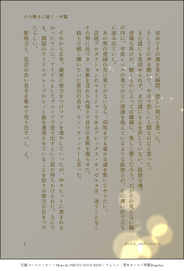 rick_underworld☆quiet followDONEキャゼルヌパイセンのマルチプレイヤー感。書けば書くほど後付け設定が飛び出てきてしまい……いっそ全部盛りしてみるかとぶち込んだら長くなりそうだったので無理矢理中篇をねじ込んでみた。(前置きが長い)ありとあらゆるものが個人設定のif時空吟詠伝です。※尚、どうやらこの時空でも☕️は跪いてくれないということが確定しました。(早くも当初の目的から脱落……) show all(+5 images) Tap to full screen (size:630x928).Repost is prohibited Let's send reactions! freqpopularsnackothersPayment processing Replies from the creator Follow creator you care about!☆quiet follow rick_underworldDONE「事象の地平面(event horizon)」という単語を知ってしまい、これを銀Aで使わずして何処で使うのか……!と、興奮した結果、🌹←☕️が出来上がった次第。 rick_underworldMOURNINGヤン視点。不眠の気配添え。https://twitter.com/solla_ga/status/1842186873747485118?t=D8RzFfNVKyBclpzXjSXXkA&s=19こちらを拝見した瞬間あまりにもツボ過ぎて脳内🌹☕️妄想が止まらず……。空さんに許可を得て、妄想を文字起こしさせていただきました。素敵なReSo🌹☕️をありがとうございました😭🙏✨ 2 rick_underworldDONE #ReSoコプヤンモブ視点。ReSo会におけるみなさまとの会話の中で見えた幻覚。なんの盛り上がりもオチもないけど鉄は熱いうちに打て精神で。モーションかけるのは🌹なのに、☕️にあしらわれてしまう忠犬。このあとベッドの上で反撃するまでがワンセット。 2 rick_underworldDONE #ReSoコプヤン🌹視点。独裁教唆に靡かない☕️をどうにかしたい🌹は、どうにもならない☕️であるからこそ執着している。という妄想。たたかいの駆け引きを上手くやれる☕️が人の機微に鈍いのは、そうでなければいのちある人間を“使う”側でいられないのだろうと、下名は愚考致します。 rick_underworldDONEおめでとう感がまるで感じられないけれどもシェーンコップおめでとうSS。☕️の思考の海の中に、自分の居場所があるのならそれだけでいい。そんな自称無欲な男であってもいい。 rick_underworldDONE🌹2024/02/28🌹🌹イゼルローン攻略[後編]TV放送記念🌹「信じる」と言ったあなたを信じる。 2