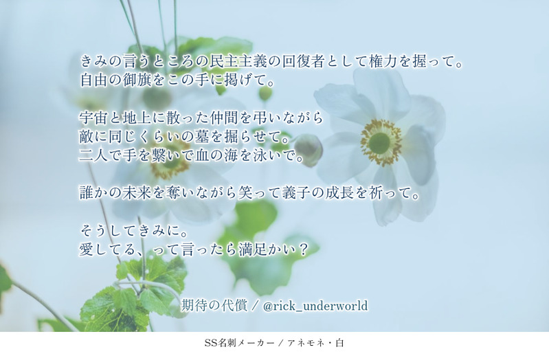 rick_underworld☆quiet followDONE貴方は☕️→🌹で『愛してる、って言ったら満足?』をお題にして140文字SSを書いてください。2023/04/19https://shindanmaker.com/375517 Tap to full screen (size:910x590).Repost is prohibited Let's send reactions! freqpopularsnackothersPayment processing Replies from the creator Follow creator you care about!☆quiet follow rick_underworldDONE「事象の地平面(event horizon)」という単語を知ってしまい、これを銀Aで使わずして何処で使うのか……!と、興奮した結果、🌹←☕️が出来上がった次第。 rick_underworldMOURNINGヤン視点。不眠の気配添え。https://twitter.com/solla_ga/status/1842186873747485118?t=D8RzFfNVKyBclpzXjSXXkA&s=19こちらを拝見した瞬間あまりにもツボ過ぎて脳内🌹☕️妄想が止まらず……。空さんに許可を得て、妄想を文字起こしさせていただきました。素敵なReSo🌹☕️をありがとうございました😭🙏✨ 2 rick_underworldDONE #ReSoコプヤンモブ視点。ReSo会におけるみなさまとの会話の中で見えた幻覚。なんの盛り上がりもオチもないけど鉄は熱いうちに打て精神で。モーションかけるのは🌹なのに、☕️にあしらわれてしまう忠犬。このあとベッドの上で反撃するまでがワンセット。 2 rick_underworldDONE #ReSoコプヤン🌹視点。独裁教唆に靡かない☕️をどうにかしたい🌹は、どうにもならない☕️であるからこそ執着している。という妄想。たたかいの駆け引きを上手くやれる☕️が人の機微に鈍いのは、そうでなければいのちある人間を“使う”側でいられないのだろうと、下名は愚考致します。 rick_underworldDONEおめでとう感がまるで感じられないけれどもシェーンコップおめでとうSS。☕️の思考の海の中に、自分の居場所があるのならそれだけでいい。そんな自称無欲な男であってもいい。 rick_underworldDONE🌹2024/02/28🌹🌹イゼルローン攻略[後編]TV放送記念🌹「信じる」と言ったあなたを信じる。 2 recommended works SasameREHABILI細雪んとこの獠ちん香にゃんで「最初に好きになったのは」と「かすめる」のお話はどうでしょう? 4ツイート(560字)以下だと嬉しいですっ!#CHしたったー #shindanmakerhttps://t.co/ou3tHwUc49香にゃん!いいのか!?ホントにその男でいいのか!??www 2 はすさんDONEhttps://shindanmaker.com/pic/s_572991/089abb00e3914e14afe678491065ed5ff85702a3_wct このカラーパレットで描いてみましょう。#shindanmakerhttps://shindanmaker.com/572991 yume_kuraDOODLEラビ夢↓お題メーカー今日のラビと夢主リビングで寝落ちているのを発見。ほんとはベッドで寝たほうがいいんだけど、もうちょっと寝かせてあげよう。風邪を引かないようにブランケットをかけておく。今日もおつかれさま。#shindanmaker #今日の二人はなにしてる motiduki07DONE7RTされたら電車の中で目をそらして「おっきい…」と言うもちづきのウツハン♀をかきましょう。#shindanmakerhttps://shindanmaker.com/685597現パロなのか?ふわっとしてる。ウ教官社会人愛弟子ちゃん大学生で一緒にウのお家に帰る電車の中です。 749 titose0401hDONE貴方は洋花で『聞こえなかった告白』をお題にして140文字SSを書いてください。#shindanmakershindanmaker.com/587150🌸道はなんて言ったのか、洋が聞きたいことなのかはたまたその逆か…🌸道は洋が傷を付けられるのが気に食わないんだよなぁ Rin67595350DONE180 ▽▲▲リスカ アムカ何でもオッケーって人だけ べろす丼DONE木曜なのでアナログどんべと言いつつひかりな絵。もうすぐクリスマスでございますがこの時期になるとサンタ服なひかりちゃん描きたくなってるかもしれない紙はホワイトワトソンと透明水彩で塗ったひかりちゃんとこっそりうどんむし。うどんむしの大きさはある程度変えられるらしい SshearestisDOODLE866-867 4 ponDOODLEほわ