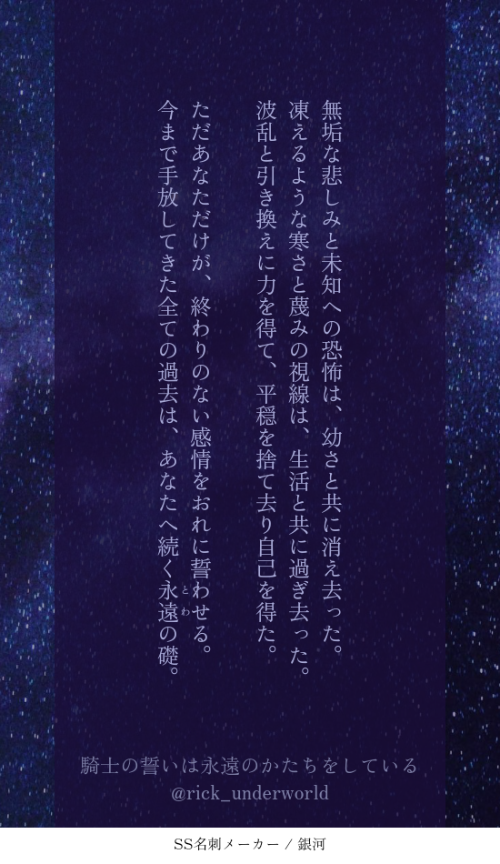 rick_underworld☆quiet followDONE貴方は🌹☕️で『永遠を現実にしてしまう人』をお題にして140文字SSを書いてください。2023/08/15https://shindanmaker.com/375517二人はきっと、お互いの感情がこれから将来(さき)も無くなりはしないということを知っている。 Tap to full screen (size:550x950).Repost is prohibited Let's send reactions! freqpopularsnackothersPayment processing Replies from the creator Follow creator you care about!☆quiet follow rick_underworldDONE「事象の地平面(event horizon)」という単語を知ってしまい、これを銀Aで使わずして何処で使うのか……!と、興奮した結果、🌹←☕️が出来上がった次第。 rick_underworldMOURNINGヤン視点。不眠の気配添え。https://twitter.com/solla_ga/status/1842186873747485118?t=D8RzFfNVKyBclpzXjSXXkA&s=19こちらを拝見した瞬間あまりにもツボ過ぎて脳内🌹☕️妄想が止まらず……。空さんに許可を得て、妄想を文字起こしさせていただきました。素敵なReSo🌹☕️をありがとうございました😭🙏✨ 2 rick_underworldDONE #ReSoコプヤンモブ視点。ReSo会におけるみなさまとの会話の中で見えた幻覚。なんの盛り上がりもオチもないけど鉄は熱いうちに打て精神で。モーションかけるのは🌹なのに、☕️にあしらわれてしまう忠犬。このあとベッドの上で反撃するまでがワンセット。 2 rick_underworldDONE #ReSoコプヤン🌹視点。独裁教唆に靡かない☕️をどうにかしたい🌹は、どうにもならない☕️であるからこそ執着している。という妄想。たたかいの駆け引きを上手くやれる☕️が人の機微に鈍いのは、そうでなければいのちある人間を“使う”側でいられないのだろうと、下名は愚考致します。 rick_underworldDONEおめでとう感がまるで感じられないけれどもシェーンコップおめでとうSS。☕️の思考の海の中に、自分の居場所があるのならそれだけでいい。そんな自称無欲な男であってもいい。 rick_underworldDONE🌹2024/02/28🌹🌹イゼルローン攻略[後編]TV放送記念🌹「信じる」と言ったあなたを信じる。 2 recommended works SasameDONEあなたは5RTされたら「ね…身体が、熱いの…」の台詞を使って細雪を描(書)きましょう。#shindanmakerhttps://t.co/iyLUWeoRDQ恋人未満の二人😆😆😆 サンバ隊DOODLEサンバ隊のイメージカラーは青で、身長は183cm 、タレ目で方耳ピアスが特徴的です。ファンからは、ダンスの上手さと天使っぷりに定評があると言われています。#男性アイドル化 #shindanmakerhttps://shindanmaker.com/412964 SasameREHABILI細雪さんとこの獠と香で「銃弾」と「かすめる」のお話はどうでしょう? 2ツイート(280字)程度だと嬉しいですっ!#CHしたったー #shindanmakerセイラネタで失礼します💦💦 はすさんDONEshindanmaker.com/pic/s_572991/4937db26b7dc0558a14e4b8ce73b4f8edddf4628_wct このカラーパレットで描いてみましょう。#shindanmakerhttps://shindanmaker.com/572991 aosabikinakoTRAINING貴方はチア相で『罠だったとしても』をお題にして140文字SSを書いてください。#shindanmakerhttps://shindanmaker.com/375517 aosabikinakoTRAINING貴方はアオ相で『とっちゃ、やだ。』をお題にして140文字SSを書いてください。#shindanmakerhttps://shindanmaker.com/375517 aosabikinakoTRAINING貴方はチア相で『愛せるなら愛してみろ』をお題にして140文字SSを書いてください。#shindanmakerhttps://shindanmaker.com/375517 aosabikinakoTRAINING貴方はハル相で『うん、知ってる』をお題にして140文字SSを書いてください。#shindanmakerhttps://shindanmaker.com/375517 沙弥(さや)DONE※拙宅好きな方向け、彦殿一頁になっちゃった。拙宅tkgw家、評定終わり頃になると確実に乱闘するので背後では色んなものが飛び交ってる。あなたはひことのの「あれこんなにカッコ良かったっけ?」という台詞を使った1コマ漫画を描きます。#この台詞を使って1コマ漫画 #shindanmakershindanmaker.com/524501