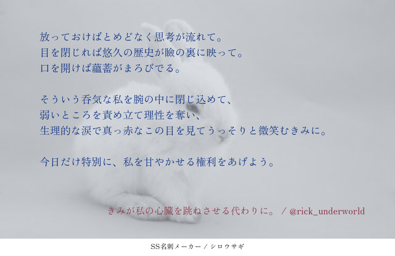 rick_underworld☆quiet followDONE貴方は🌹→☕️で『甘やかせる権利』をお題にして140文字SSを書いてください。2023/08/21https://shindanmaker.com/375517本日は🐰の日、らしいので。(完成してから☕️→🌹視点で書いていたことに気付いた😇) Tap to full screen (size:910x590).Repost is prohibited Let's send reactions! freqpopularsnackothersPayment processing Replies from the creator Follow creator you care about!☆quiet follow rick_underworldDONE「事象の地平面(event horizon)」という単語を知ってしまい、これを銀Aで使わずして何処で使うのか……!と、興奮した結果、🌹←☕️が出来上がった次第。 rick_underworldMOURNINGヤン視点。不眠の気配添え。https://twitter.com/solla_ga/status/1842186873747485118?t=D8RzFfNVKyBclpzXjSXXkA&s=19こちらを拝見した瞬間あまりにもツボ過ぎて脳内🌹☕️妄想が止まらず……。空さんに許可を得て、妄想を文字起こしさせていただきました。素敵なReSo🌹☕️をありがとうございました😭🙏✨ 2 rick_underworldDONE #ReSoコプヤンモブ視点。ReSo会におけるみなさまとの会話の中で見えた幻覚。なんの盛り上がりもオチもないけど鉄は熱いうちに打て精神で。モーションかけるのは🌹なのに、☕️にあしらわれてしまう忠犬。このあとベッドの上で反撃するまでがワンセット。 2 rick_underworldDONE #ReSoコプヤン🌹視点。独裁教唆に靡かない☕️をどうにかしたい🌹は、どうにもならない☕️であるからこそ執着している。という妄想。たたかいの駆け引きを上手くやれる☕️が人の機微に鈍いのは、そうでなければいのちある人間を“使う”側でいられないのだろうと、下名は愚考致します。 rick_underworldDONEおめでとう感がまるで感じられないけれどもシェーンコップおめでとうSS。☕️の思考の海の中に、自分の居場所があるのならそれだけでいい。そんな自称無欲な男であってもいい。 rick_underworldDONE🌹2024/02/28🌹🌹イゼルローン攻略[後編]TV放送記念🌹「信じる」と言ったあなたを信じる。 2 recommended works いちにDONEレオいずへのお題は『そうしたら、僕ら最強に両思い』です。#shindanmakerhttps://shindanmaker.com/392860(レオぴ居ない&捏造設定!) 2 甘味料TRAINING12月21日『刀剣男士誰描くアンケったー』より1票を勝ち取った兼さん oic_panDOODLE貴方は時間があるなら『両手を広げてハグを求めている石窯ぱんのノマエマ』をかいてみましょう。幸せにしてあげてください。#shindanmakerhttps://shindanmaker.com/524738 SasameTRAINING細雪とこの獠ちんと香にゃんは、文中に『脱げ』を入れて【悔しい】をイメージした140文字作文を書いて下さい。#140SS #shindanmakerhttps://t.co/rV0htt2t08むっず!!! saya_wlDONE[SS]貴方はビショルキで『受け止めてくれるのはあなただけ』をお題にして140文字SSを書いてください。#shindanmakerhttps://t.co/gnBTAhVTAw##さやSS幻覚ルーキーの性別はどっちでも みみみTRAINING貴方は萌えが足りないと感じたら『欲しいものない?ってきかれてお前って答えちゃうディルアス』をかいてみましょう。幸せにしてあげてください。#shindanmakerhttps://shindanmaker.com/524738 2 かほる(輝海)DONEシティーハンター槇村香×冴羽獠原作以上の関係あなたはかほるさんちのKで【想像してた? / ごくり】をお題にして140字SSを書いてください。#shindanmakerhttps://shindanmaker.com/780366たまには嫉妬かおリンを(*´艸`*)もちろん、かおリンは後始末も全部請け負うつもりですよ(*´艸`*) 149 はるしきTRAINING【零盧】「君の目にはどう映っているのかな」#shindanmaker #この台詞から妄想するなら口調練習その2 1179 OopartsTMOURNINGろささ 香水 2