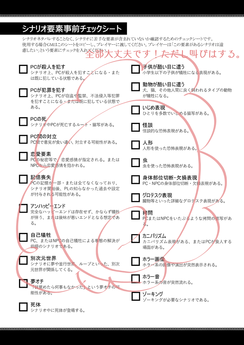 pirorikin_trpg☆quiet followMEMOTRPG地雷まとめ。二枚あるよ。ここにはかいてないですが、メタフィクション・NPCの確定ロスト等も特に地雷ではないですー。 show all(+1 images) Tap to full screen (size:4299x6071).Repost is prohibited Let's send reactions! freqpopularsnackothersPayment processing Replies from the creator Follow creator you care about!☆quiet follow pirorikin_trpgSPOILERCoC「やわらかな希求」ネタバレ🚨用意したスチル。R18G。やわきゅーのスチルということはそういうことです。pass:ok1・4・5枚目の背景は「ゲームまてりあるず」(https://game-materials.com/)様からお借りしました。 5 pirorikin_trpgSPOILER今回のho4さんのパパはこちら!ho4の子がイケメンだとお聞きしたので、イケメンパパを描こうと努力しました。 pirorikin_trpgSPOILER今回準備したもの!二枚目以降に都市伝説課おまけシのネタバレあり🚨 3 pirorikin_trpgSPOILER2枚目におまけシのネタバレがある!あともうちょっとがんばるんじゃ……! 2 pirorikin_trpgSPOILERあのこが巨大化するシナリオで用意したスチルです。ネタバレあり。シナリオ付属素材とUnsplashやみんちりえさんから素材をお借りしました。 5 pirorikin_trpgSPOILERCoC「ジャンクパーツ・フルセッション!」🚨ネタバレあり🚨