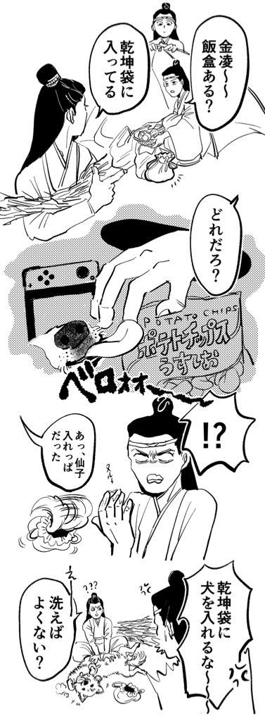 長距離移動の時に金凌は仙子をどうやって連れて行くのか、という疑問は常にあるのですが、もし乾坤袋だったら…というらくがきまんがです。(夜狩のことはキャンプみたいなものだと思っている)