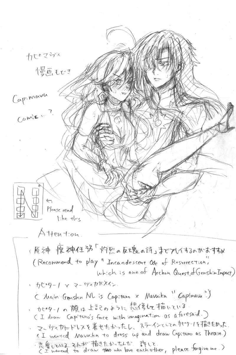 sei_sosakulab☆quiet followDOODLEAttentionカピマヴィの漫画もどき5.3verまでの魔神任務までのネタバレありカピターノの顔を捏造しているマーヴィカにドレスアップさせたかった後半になればなるほど、キスとか多い解釈違いを起こしたらごめん show all(+16 images) Tap to full screen (size:3897x5849).Repost is prohibited Let's send reactions! freqpopularsnackothersPayment processing Replies from the creator Follow creator you care about!☆quiet follow sei_sosakulabDONE書き散らしフリラウ小説※Luna Ⅰの任務内容前提※個人的には🕯+🦌のつもりだが、🕯→🦌に見えるかもしれない※序盤にモブという名の冒険者が、🦌手を出そうとしている(未遂)※🕯が🦌の体に少しだけ触れている描写がある※誤字脱字、口調ミスあったらごめん 4294 sei_sosakulabDONE「闇夜に潜むのは、ワイルドハントや獣だけでは、ありませんよ。例えば、そうーーこんなふうに」といった執着心マシマシの🕯ととってもうぶな🦌(🕯→🦌?)が描きたかっただけなのです。リクエストありがとうございました! sei_sosakulabDOODLE以前描いたカピマヴィの絵に、コピックで色置きしてみたけど、マーヴィカさんの髪の色って私たちが思い浮かべる赤じゃないことに気づき、紫で影をつけたり、オレンジでなじませたりした。カピターノさん、顔が出ちゃっているから実質スラーインさんになるけど、「あぁでもない、こうでもない」と言って塗った髪の色が思いの外よかったような気がする。 sei_sosakulabMEMO以前書いたキィムアに、コピックで着色したもの。ナタキャラでアナログで塗るのって難しいのでは……と感じた今日でした。書いた時は夢中になっていたけど、改めてみるとキィニチさんの腕の模様、向き間違えていたね……すまない。 sei_sosakulabTRAINING落書きフリラウ。試しに背景だけカラーで塗って、人は陰にしようと思って塗ったもの。めちゃくちゃ楽しかったけど、黒色のコピックを使ったら、手についてしまって、せっかく書いた背景が汚く見えてしまったということを後悔している。🦌→星降る夜、祈り、🕯→深淵の夜、巡回からの殲滅って感じで描いているので、一応、CPタグだけはつけさせてね。 sei_sosakulabMEMO以前書いたフリラウを、コピックで塗ってみたらどうなるんだろうと思って、塗ったもの。備忘録もかねて。E0000,E000,R000,R00,BV00,V22,BV34,Y00,Y21,YR21,BG13,BG34,BG49,B32,B41,RV23,W3E41,0,W1,B23,B26,B41,BV13,V22,W1,W3,W5,C3,R17,BG11,Y00,Y15,Y21 recommended works 阿枫茶啊DOODLEstyle 5 まらたびDONE🔞🈲刃丹⚔️🍁おお、🍁よ!前戯だけでイキ狂ってしまうとはなさけない…🫅⚔️ちゃんに敗北して服もTKBも弱点撃破されちゃう🍁ちゃんです💕18age over only 「yes」 2 Yosida_GenMEMO⚠️斎左種つけセス パスワ限定20↑(yes/no)左がメスイキしちゃって絶倫になっちゃう斎...みたいなおマンガ描きたい…のメモ春画 KoharuWatcherDOODLE ☁☁☁DOODLE lordofSpringDOODLE只是赤身裸体贴贴而已 3 ksnttaccountDOODLE걍 올리기엔 약노출 잇어서 쿠션씀 しまらっきょDOODLE昼間ですがセンシティブ絵5枚まとめます※瑛一くん3枚※綺瑛2枚pass:18↑? y/n 5 しゅーたろ🥚DOODLEこの回ほんとうにびっくりした