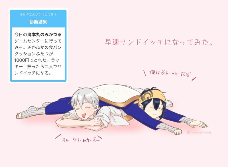 superaerial701☆quiet followDOODLE診断で遊んでいたら楽しげなのが出たのでらくがき。なんだか酔っているみたいですね。酔っ払い二振りのおふざけサンドイッチ。 #みかつる Tap to full screen (size:954x700).Repost is prohibited Let's send reactions! freqpopularsnackothersPayment processing Replies from the creator Follow creator you care about!☆quiet follow superaerial701DONEみかつるみつかる9で発表した新作マンガ「雨上がりの本丸で」です。会場で読んでくださった方ありがとうございました! 4 superaerial701DOODLEもうすっかり葉桜になってしまいました。今日も弊本丸のみかつるは平和です。 superaerial701DONE人の身を得て早10年。でもまだ10年、鋼の時にはできなかったことができるようになって手を繋ぐこととか些細なことでもいちいち感動していたらいいな。「花見にいこうか」みかつるの日おめでとうございます!! superaerial701DOODLE平静を装いつつ祝装の衝撃をくらっている鶴丸さんです。あんなの突然見せられたら腰ぬかすやろ!!!!(最大級の賛辞) superaerial701TRAININGお年賀的な🐍今年もどうぞよろしくお願いいたします superaerial701DOODLE新しいギアを手に入れたのでお試しらくがき related works よかMAIKING数万年ぶりにちゃんと(?)線画描いたみかつる よかDOODLEミニみかつる よかTRAININGなんとなく飛びついてそのまま会話するみかつる superaerial701DONEお散歩みかつる。梅の景趣ばんざーい!満開の梅の中を散策するのも好きですが、ぼんやり咲いているなぁとわかるくらい遠くの梅林を眺めるのも好きなのでお散歩してもらいました。二人とも半纏着用の完全オフスタイルです(笑) よかDOODLEお団子イベントやっと終わりました よかTRAINING日常のみかつる遠近感とは よかMAIKING近いみかつる よかDOODLEみかつる※たぶんR15くらい superaerial701DOODLEお祭り衣装良いですねぇ良いですねぇ。お忍び🌙さんもこれにはニッコリ。諸事情で現地参戦できないので間違っているところ多々あると思いますがご容赦を。