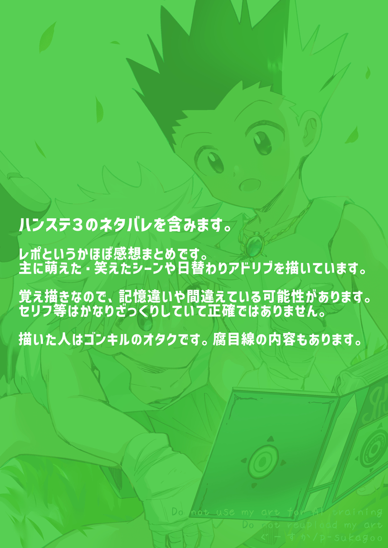 p-sukagoo☆quiet followSPOILER八ンス〒3 5/20・5/22・5/23すべてマチネの三公演分ネタバレ感想レポです。前回あげたものの修正も含みます。 ##全年齢 show all(+5 images) Tap to full screen (size:1417x2000).Repost is prohibited Let's send reactions! freqpopularsnackothersPayment processing Replies from the creator Follow creator you care about!☆quiet follow p-sukagooDONEコ"ンくんに喘ぎ声を聞かれたくなくて唸り声をあげてしまうキノレアくん成人済み?(yes/no)実験的にフォロワー限定公開にしてます。 2 p-sukagooDOODLE天使の日👼 p-sukagooINFO【サークル参加します!!】01月25日(東京)TOKYO FES Jan.2026内 ENDLESS×HUNTER 2| #イベントGO_赤ブー https://www.akaboo.jp/event/item/20202496.html コ″・/キ」レ成人向け本予定してます!X https://x.com/yamiochimoemoe p-sukagooDONEエアブー秋の感謝祭展示用のゴンキル漫画10Pです!エアイベント期間中の限定公開です。成人済みの方のみ閲覧できます。パスワードはサークルスペースにてご確認ください。https://air-boo.jp/675197/サークルスペースに飛べない方はこちらから飛んでください。https://x.com/yamiochimoemoe/status/1970636238635041223?s=46&t=jB_aRBgGxmfZeRupflecow 10 p-sukagooPROGRESSwip間に合うかあやしい➂成人済み?(yes/no) p-sukagooPROGRESSwip間に合うかあやしい②成人済み?(yes/no) recommended works すしすしすしDONE #キルア 花療りみTIRED #ハンターハンター #HUNTERHUNTER #キルア #ゴン気力なくなりました😂 nem_oekakiDOODLEキルクラ好きのお友達に塗ってもらった線画構図はピンタレストから moko_shiro_toriPAST(2020.10.20) 2 sapporoumaiDOODLE #ハンターハンター#ゴン#キルア#クラピカ#レオリオ えりンギ02。PROGRESS最近H×Hしか描いてない気がする。 SAKURAPROGRESSとりあえず途中まで 5 SAKURAPROGRESSにょキルと、原作軸の男の子キルアを描きたかったやつです。女体化の世界線はあ年齢操作してます。16歳くらい ぽいゆらDOODLEごんきるの超らくがきじゃよ!男の子同士のノリでちょっと試してみよう✧ってはぢめて〜の〜ちゅぅ〜した翌朝の2人。(ちゅーする間柄の2人はおはようもおやすみもいってらっしゃいもちゅーするもんだと思ってるこ"ん)