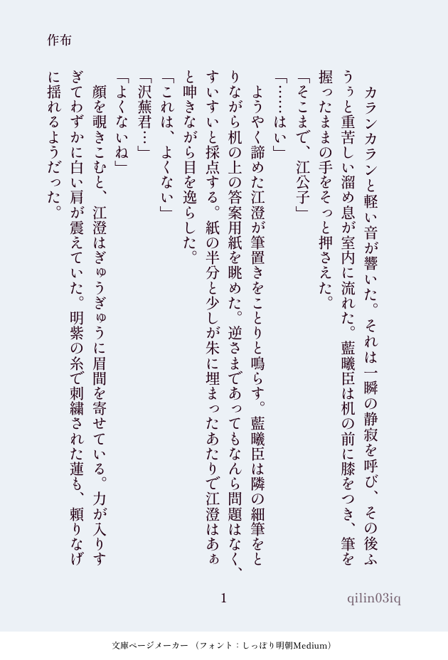 江公主は蓮茎の葉や花を現した衣を着て、江公子は甘藷の葉や花を金糸で刺繍された紫の衣を着ていた。蓮茎の国では代々江家の子は蓮茎を司るが、なぜか江公子は蓮茎を育てる力よりも甘藷を育てる力が強いと聞く。故に、甘藷を模した衣なのだろう。その紫の衣は江公子によく似合っていた。床すれすれの長さで背中で蝶結びにされた黄色い帯は小さく跳ねるのにあわせてふわりふわりと可憐に揺れる。胸元を彩る赤い帯もやはり蝶のようで、甘藷の花の蜜を求めにやってきた蝶にも見えた。紫色をした甘藷の花は実を結ぶことが出来なくなった際に咲くというから、藍渙は実物をまだ見たことないが、きっと公子のように可憐なのだろうと幼心に思った。
