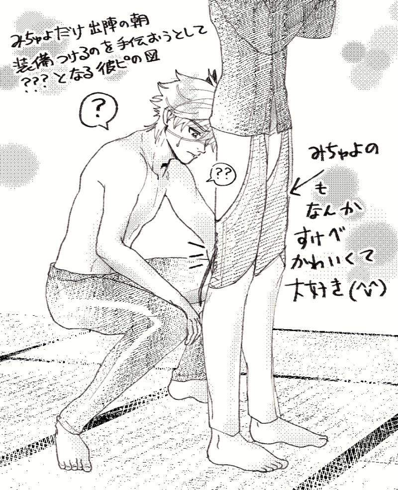昨晩お楽しみで、みちゅよだけ出陣の朝、装備装着するのを手伝おうとして、ジョカノの尻の前で固まる彼ピ。みちゅよの装備も、鬼丸さんの装備も装着大変そう( *´艸`)(男士くん、みんな装着大変そうだけど!)