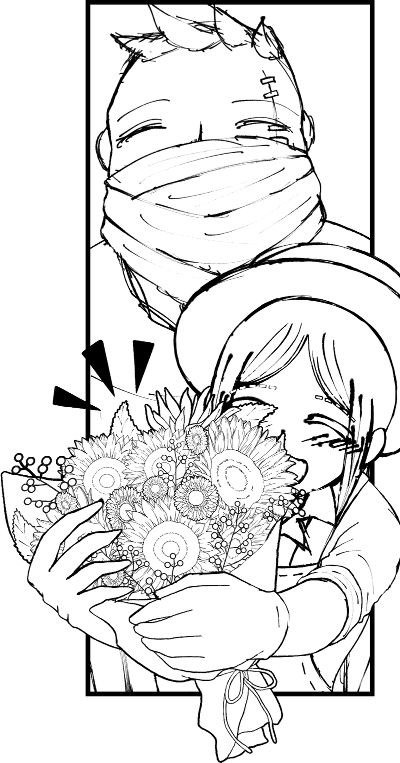 今描いている漫画の一コマ。お花は素材を使っているから浮いちゃっているけど、仲良さげなベイカー親子が描けたので満足。