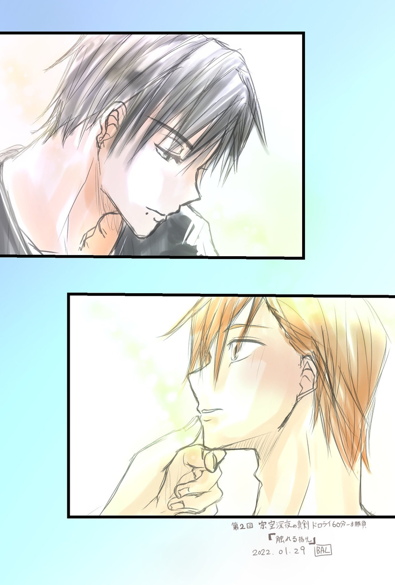 ばるる☆quiet followDONE【宗空】ワンドロで描いた2枚似た感じで描いたのに理由があるので。リアルに触れてる「触れる指先」と画面越しに相手に触れて同じ寮内にいるのに触れられないもどかしさに、お互いが思い誘うし誘われ「こればいいだろ」「じゃぁ行く」という感じで「やっぱり触れたい」「触れられたい」という意味で似た感じで描きました最初こそ画面に映る相手に笑いかけてますが、相手に触れ合える距離までがもどかしい show all(+1 images) Tap to full screen (size:1378x2039).Repost is prohibited Let's send reactions! freqpopularsnackothersPayment processing Replies from the creator Follow creator you care about!☆quiet follow ばるるDOODLE【宗空】(宗司は膝部分のみ描写)「いいよ」肌色多めもう少し2次元風に落とし込みたいこういう絵を描くとなんかお固くなってしまうの何とかしたい1枚目がリテイク2枚目がリテイク前(モデルポーズ有り) 2 ばるるDOODLE神楽坂宗司の寝起きはシャキッと起きるよりは少し寝ぼけている時間があるといいなぁと。身動ぎした隣に寝ている誰かに 「はよ。起きたか?」って普段より緩めのトーンで声かけしてくれるやつです(この絵実は寝起きという事で髭を描くか描かないかで30分迷いました)(自制心が勝ちました) ばるるDONE在原守人くん誕生日おめでとうイラスト ばるるDOODLE自由時間時間切れで描き終わらなかったCOT部宗司のデフォルメラシードのデフォルメがよく分からんくなってきて唸ってたら時間すぎてました…2枚目のはなんかバランス悪くなってきて直そうと思ったら1枚レイヤーで描いてた宗司です。結局全部描き直した。 2 ばるるDONE【月野百鬼夜行】SOARA先輩組完成→完成までの経路と色差分小鬼好きすぎて小鬼妄想がパーンっ!となって気がついたら描いてましたシロツメクサの花言葉を調べて貰えると良きかと(もちろんいい意味の方ね) 5 ばるるPAST【宗空】2023年5月に出した宗空コピー本の全文です空が宗司がしてくれる腕枕に……の話です。 13 recommended works hisagi_regu24PROGRESS #ツキプロ #八重樫剣介誕生日絵止まってる…💦 完成させる気はあるんだ… fu_hirokanMOURNING #ツキプロ #宗像廉 #桜庭涼太 かぼすDOODLEピカチューつばち RakkoDONE昂くん ユキウサギDOODLEろあくん テノ(tenokaku)DOODLEくべるの双子!!(前に描いたの2年前ぐらいかも……) はるのDOODLE💗 はるのDOODLEおめでとうございます🎉 はるのDOODLEアイノビート / 白瀬優馬