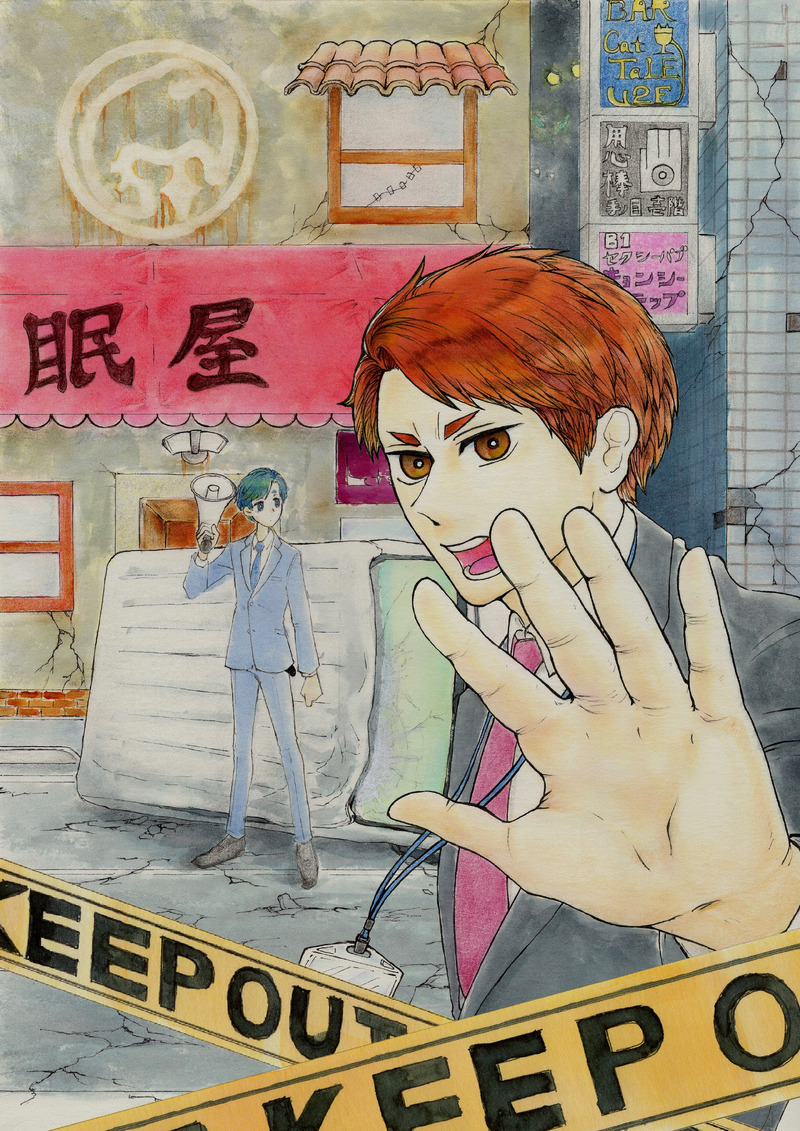 表紙はインク下塗り→パンパステル→色鉛筆描き込み。手前の人物(タマキくんといいます)の髪色がお気に入りです。