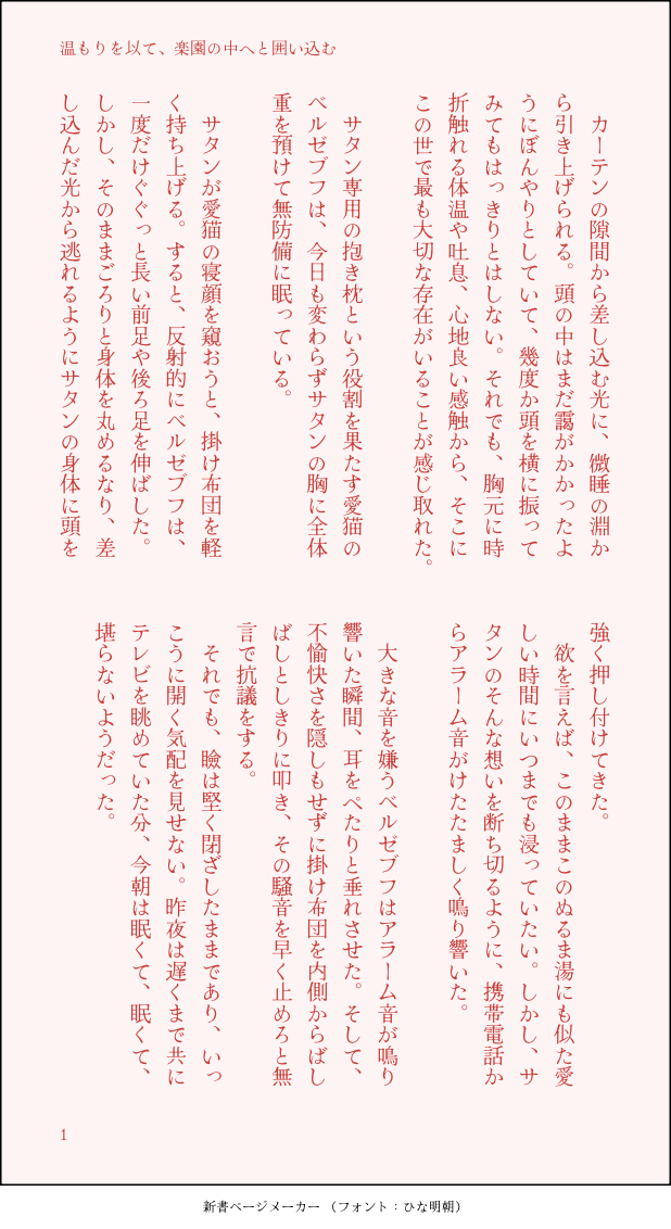 yuki_mgd☆こそフォロできた温もりを以て、楽園へと囲い込む(サタブフ) 猫のベルゼブフ様と飼い主のサタン様が共に何でもない日を過ごしているだけの話です。山もオチも意味もない上に、無駄に長い。 誤字脱字、表現の誤りや重複、ネタ被り等ありましたらすみません。 すべて表示(+11枚) タップで全画面(原寸:618x1132)無断転載禁止 リアクションをたくさん送って応援しよう! よく使う人気おやつその他支払処理中 作者からのリプライ 気になる人をどんどんフォローしよう!☆こそフォロ yuki_mgdできたこの楽園に身を捧げる(サタブフ) 一つ前の猫のベルゼブフ様と飼い主のサタン様の話の蛇足な続きで、猫のベルゼブフ様の視点が中心の話です。こちらも無駄に長いです。 誤字脱字、表現の誤りや重複、ネタ被り等ありましたらすみません。 12 yuki_mgdできた温もりを以て、楽園へと囲い込む(サタブフ) 猫のベルゼブフ様と飼い主のサタン様が共に何でもない日を過ごしているだけの話です。山もオチも意味もない上に、無駄に長い。 誤字脱字、表現の誤りや重複、ネタ被り等ありましたらすみません。 12 yuki_mgdらくがき猫のベルゼブフ様と、飼い主のサタン様の話。サタブフです。山もオチも意味もない。誤字脱字、表現の誤りや被り、ネタ被り等ありましたらすみません。 5 yuki_mgdできた青い春に忍ばせた罠/甘く囚われる(サタブフ)高校生パラレルで、リクエスト頂いたシチュエーションで書かせたもらったものです。無駄に長い。誤字脱字、表現の誤りやネタ被り等ありましたらすみません。 18 yuki_mgdできた小さな脚がゆらゆらと:手脚を絡めて(サタブフ) 弱ってヴィータの親指程度の小さな身体になってしまったメギド体のベルゼブフを拾ったサタン(メギド体)の何でもあり気味のifパラレル話です。 書きたいところだけ書いたのに、無駄に長い。 誤字脱字、表現の誤りや被り、ネタ被り等ありましたらすみません。 16 yuki_mgd作業進捗タイッツーのネタメモに投げたメギドのサタン様×メギド時代の記憶がない追放メギドのブフさんの謎パラレル。未完成な上に、後半にしかサタン様は出てきません。誤字脱字、表現の誤りや被り、ネタ被り等ありましたらすみません。原作には登場しない人物の描写もあります、ご注意下さい。 6