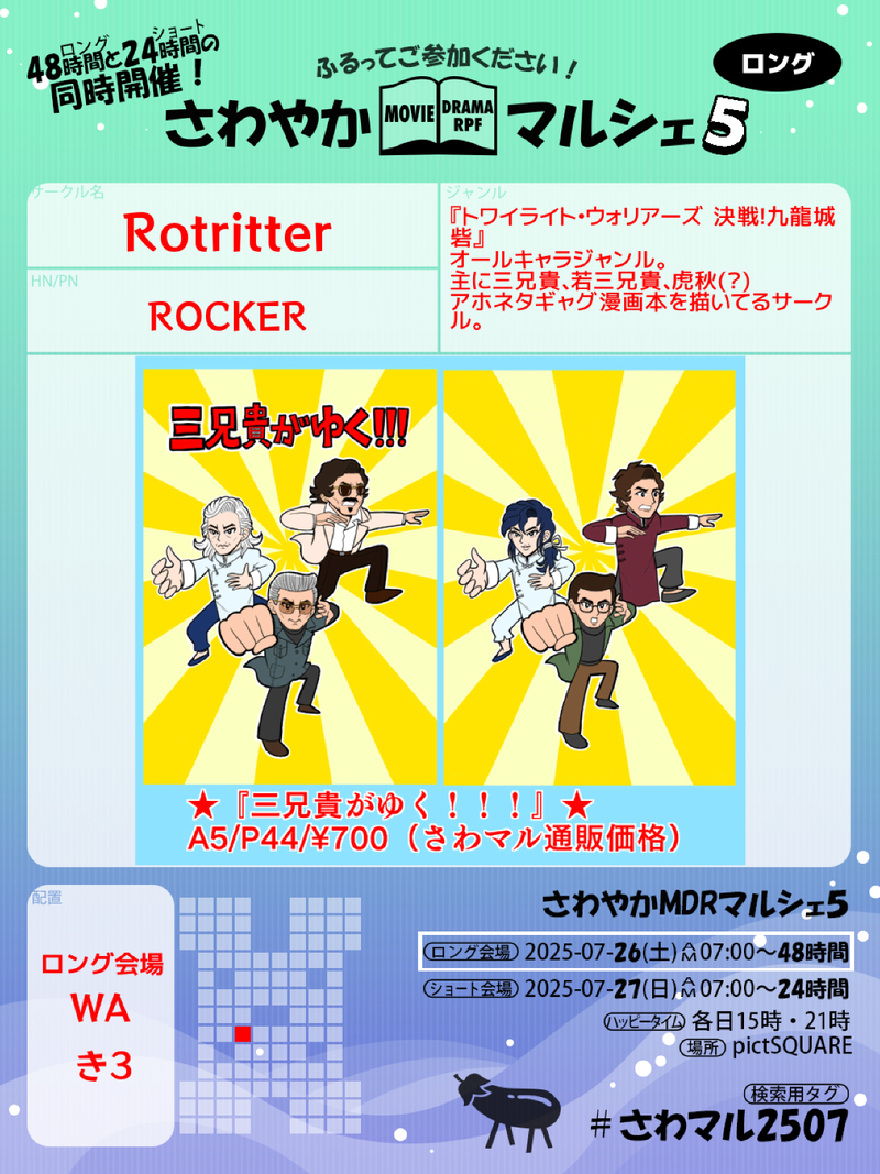 ROCKER☆quiet followINFOさわマル5参加します!ムぷち新刊のBOOTH通販します!!あと、新規絵が出来たら展示します💪💪 #トワイライト・ウォリアーズ #九龍城寨之圍城 show all(+1 images) Tap to full screen (size:1168x1558).Repost is prohibited Let's send reactions! freqpopularsnackothersPayment processing Replies from the creator Follow creator you care about!☆quiet follow ROCKERMENU11月16日トワウォオンリーイベ、当サークルRotritterのスペースは【東4ホール“ソ”06b】です!素敵なゲスト様をお迎えした三兄貴アホネタギャグ漫画本第2弾の新刊発行を予定しております!!😆👍✨あと、7月ムパラの既刊を再販いたします。 ROCKERDONE11月16日トワウォオンリーイベント新刊の表紙 ROCKERMENU今回のさわマルで展示したやつ。11月オンリーイベント合わせ新刊告知やサンプルやお品書きなど。#さわマル2510 #ト_イラ_トウォ_アーズ 3 ROCKERDOODLE自分の🍂ニキコスをトレスしたやつ。⚠️↓コス写真注意 3 ROCKERDONEワードパレット3つ目のお題『ジャスミン』 2 ROCKERDOODLEワードパレットお題その2『○△□』 related works ROCKERMENU2025年7月12日(土)MPぷちmix2新刊『三兄貴がゆく!!!』A5/P44/500円三兄貴がワチャワチャしとるだけのアホネタギャグ漫画本です。 3 ROCKERPAST秋兄貴には黒百合になって頂きました。 misonikomi0817DOODLE占祖血があるのでワンクッションメガネはどこかにいきましたお互いの背中を守れる存在だと嬉しい ROCKERDOODLE雷バニ🍂。バニーの日めっちゃ遅刻。 ROCKERDOODLE三兄貴にダセェ服を着てもらった ROCKERDOODLE友人曰く、ワシの描く秋兄貴はこんな感じらしい(笑) tamaoDOODLEトワイライト・ウォリアーズ 決戦!九龍城砦 8 ROCKERDOODLE虎秋アクスタほすぃ... mimico_mochi3DOODLE九🐲城の、洛信です。洛→信の矢印の話。 3365 recommended works nnn_132_83DOODLEボツ供養 2 let_it_cook32DONEおっぱい星人な聡狂🍓🚬です。18↑?(yes/no) 6 お米おばけDOODLE耳の辺りからいい匂いがする女の子をだっこする(グエスレ) 八月朔よるDONE描き納めのタル夢ちゃん 2 ぺこむDONE20241201 クマネコミュージック komekousagi3DONE記念絵を全員分として完成させることができました第1次のメンバーの皆さんに感謝を込めてpass「(グループ名※記号は全角で)」 17 なかわたDOODLE新衣装胡桃かわいい qs_teapotDOODLEクトゥルフ神話TRPG『22時に乾杯!』 わさをPAST過去のポメンデやお蔵入り作品などなど。 6