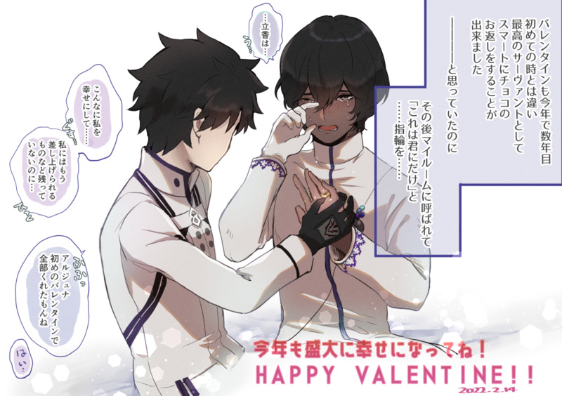 チョコが全鯖が貰えるもので、バレンタインの贈り物は特別ではないんだと知った。もっと特別でありたい、自分だけを見て欲しい。そんな欲望を秘めつつも、それを顔に出さずちゃんとお返しが出来た。これでいい…と思っていてからの💍で涙腺崩壊してほしい~~~!後に愛おしそうに💍のしている手を手袋越しに眺めて欲しい…