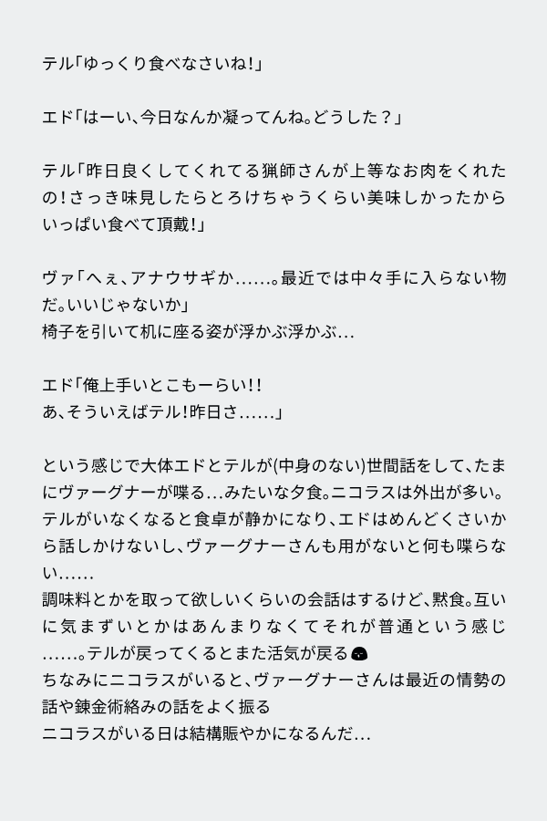 Kinmed25253486☆quiet followDOODLEうちの子達の日常話(夕食)家族関係?は割とリアルなとこある気がする……自分の経験も元にしてるからそして誤字…上手いとこ→美味いとこ冒頭夕食という説明を入れるの忘れてた Tap to full screen (size:600x900).Repost is prohibited Let's send reactions! freqpopularsnackothersPayment processing Replies from the creator Follow creator you care about!☆quiet follow Kinmed25253486DOODLEいつまで経っても創作が進まないのでいっそ仮で文を書いてしまおう…という考えのもと生まれたのがこれです。ハイ、ドーン。拙い文ですけど、許してくださいな!!これからちょっとずつ書いていきたい🗓️タイトル未定なので、一旦仮として「赤白小説」と呼んでいきます(ネーミングセンスはない)エドちゃの方も書きたいけど、設定をまだコネコネしてるので先になりそう……。 1725 Kinmed25253486DOODLEこいつらがエッッな関係になる妄想ができない他人が描くならいいんだけど、自分で描こうとすると脳が拒否し出す脳内ヴァーグナーとエドちゃからの全力拒否…?途中までは考えられても突然スンッとなる家族としてカウントしてるからかもしれない。兄弟親子は気まずいしまずい的な未来永劫師弟関係✌️でもエッな妄想もあってもいい(深夜テンション)この絵は特になんも考えてないです Kinmed25253486DOODLEらくがき Kinmed25253486DOODLEえ!?イケメン途中のくせにホーム画面にするやつ。何これイケメン!? 3 Kinmed25253486DOODLEえふごアズライールにブッ刺された何この美形……?すき…前まではサラサラ長髪美人顔イケメンなんて別になんとも思わなかったんですよ。なんでこんなブッ刺されてるんだろうな!!?主な原因はヴァーグナーとかいう男のせいなのですが… 4 Kinmed25253486DOODLEひ、人妻ヴァーグナーさんだって〜〜!?!?別にそんな意図なかったのに書いた後「ん…?なんか人妻っぽいな…」と思ったやつです。割とノッテくれそう人妻成人男性(21)……(?) 2