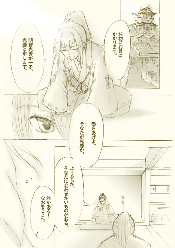 光慶の過去話を妄想して勢いで描いてみたものです。ピクシブでは途中で切ってしまったので、こちらでは一気に…。鉛筆で描いてフォトショで加工なので、線がガサガサですが…^^; 時間ができたら清書して明智家関係で本にしたいなぁ~…。